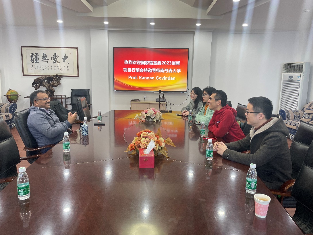 331日上午9点,南丹麦大学Kannan Govindan教授受邀来访人兽性交 。作为我院国家留基委创新项目特邀导师,Govindan教授和即将出访南丹麦大学的2位博士生亲切座谈,副院长沈滨教授主持了本次会议,并对Prof. Kannan Govindan的来访表示热烈的欢迎。