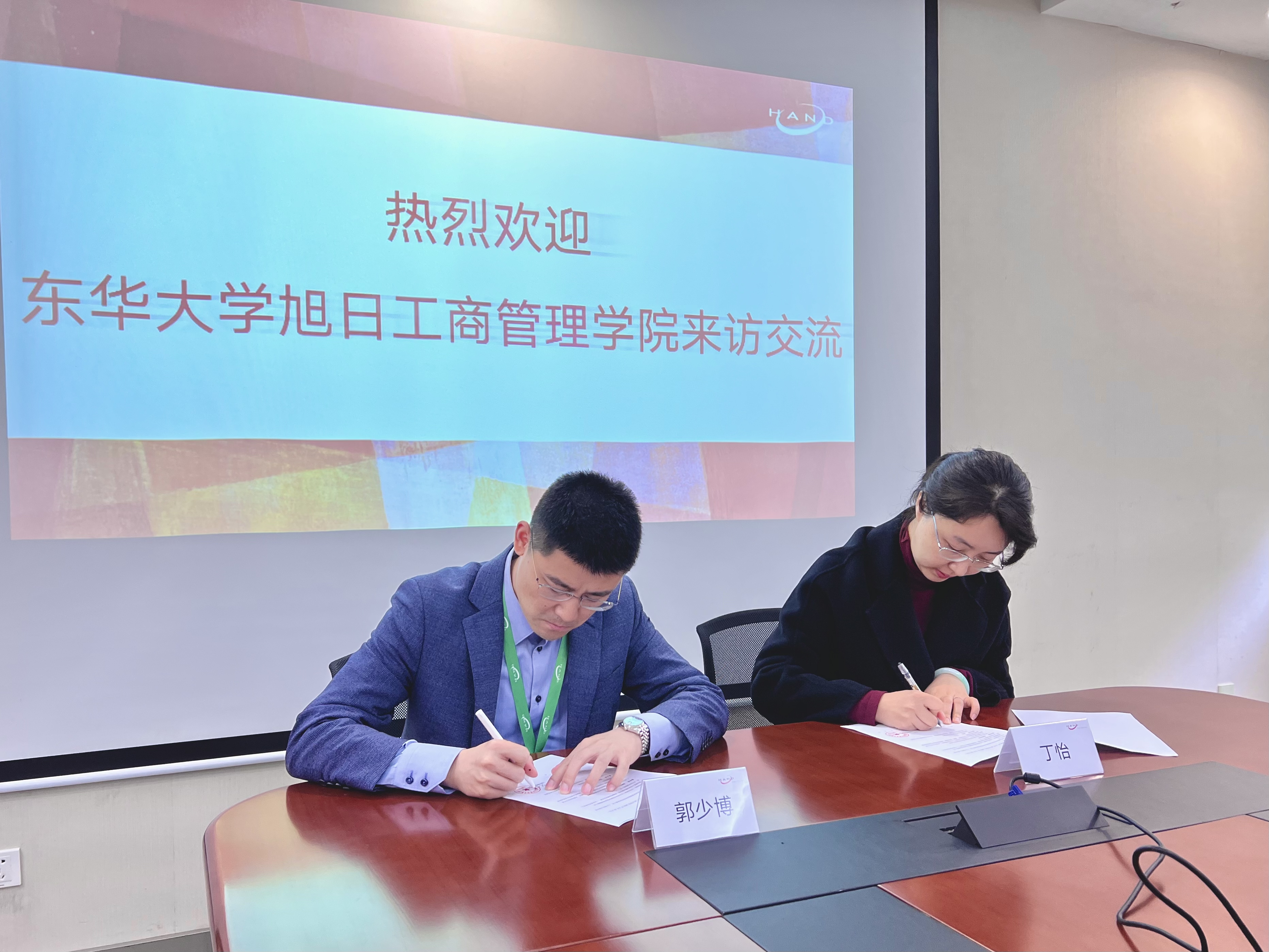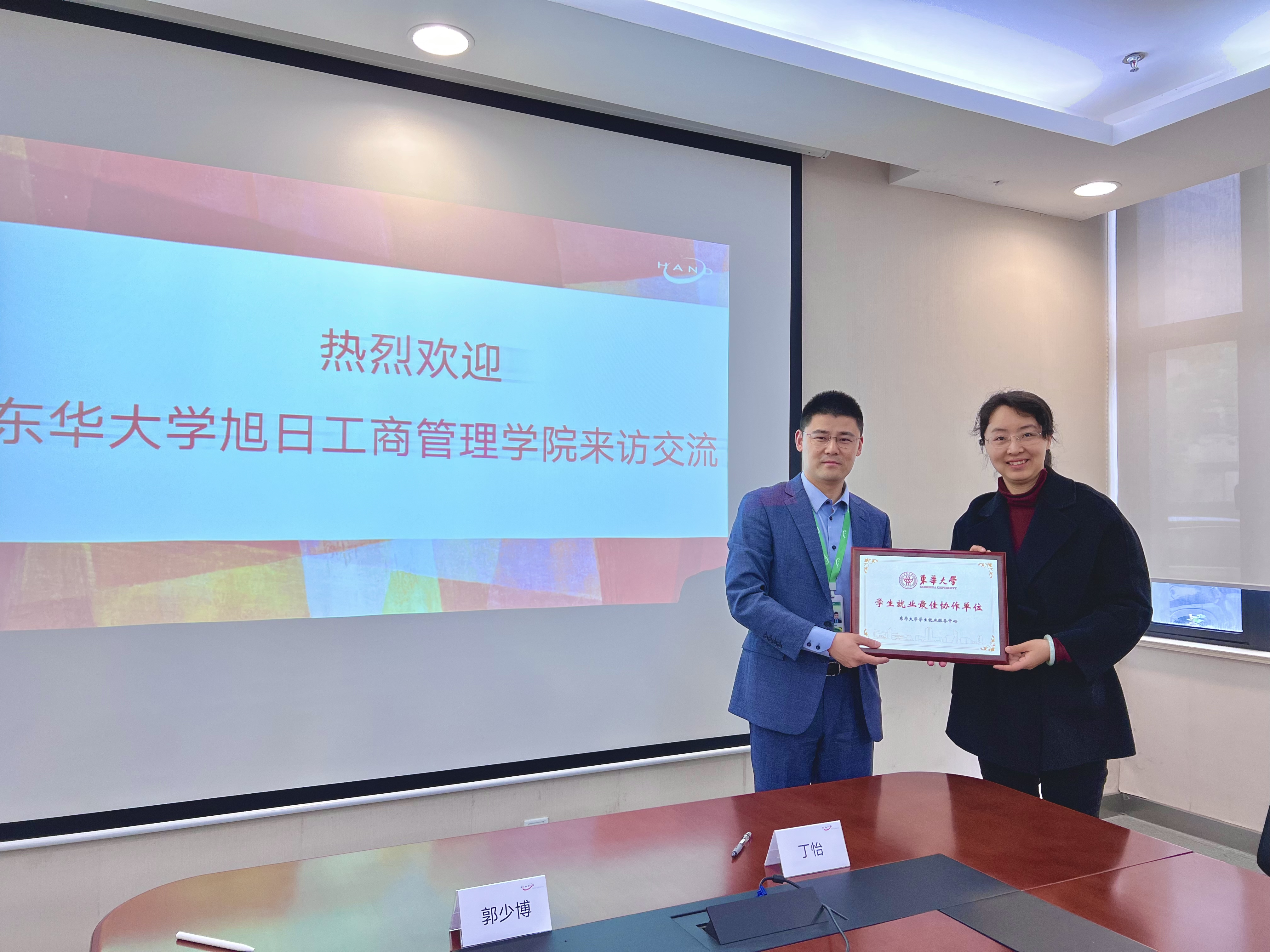 丁怡和郭少博分别代表学院和汉得签署就业实习实践基地框架协议,丁怡代表学院向汉得颁发人兽性交 2023年学生就业最佳协作单位铭牌。
