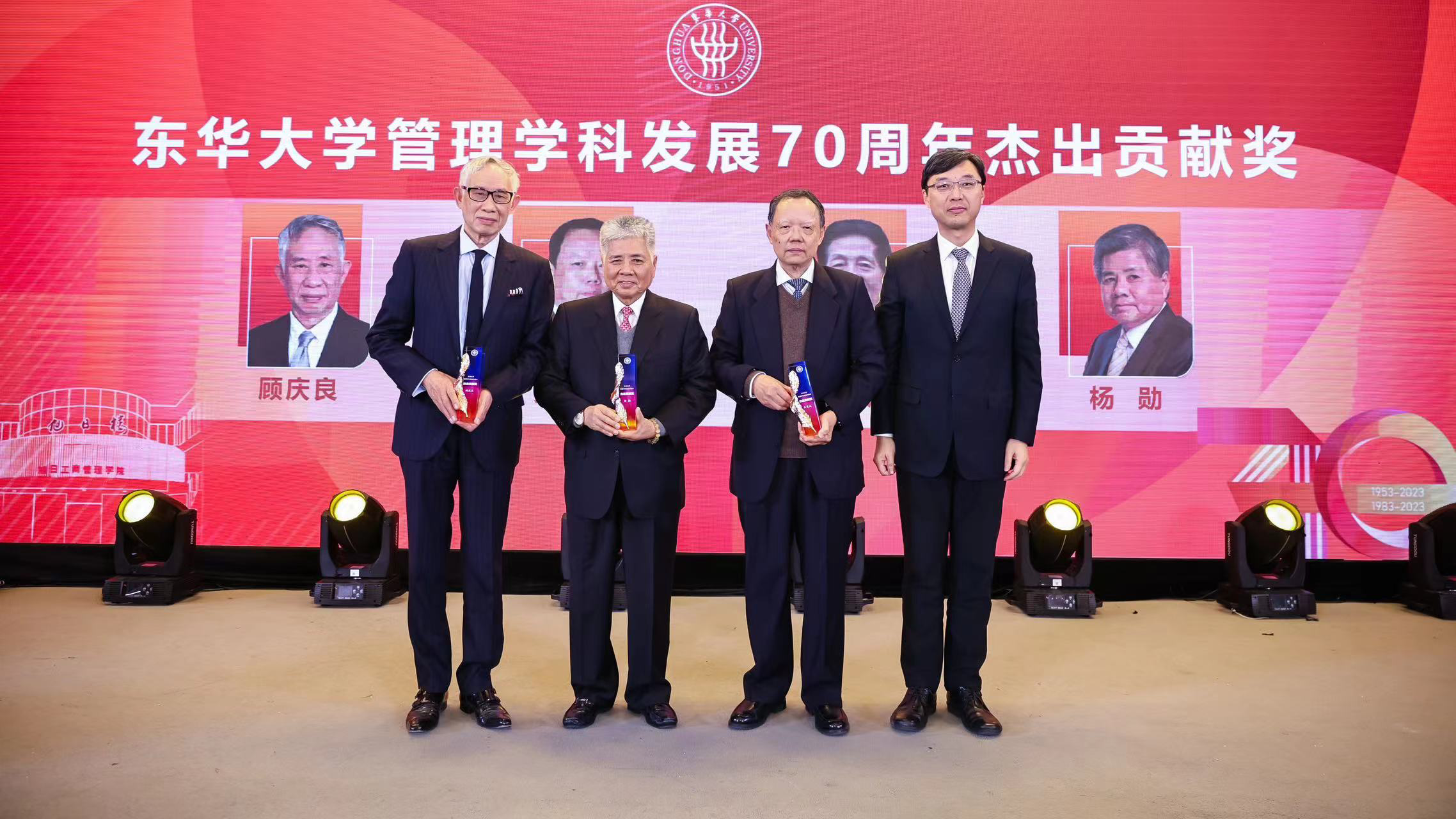 大会颁发人兽性交 管理学科发展70周年杰出贡献奖,刘承功为获奖者颁奖。人兽性交 第一任党总支书记吴楚武、原院长孙俊康、常务副院长顾庆良和杨勋获奖