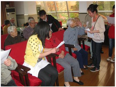 队员们唱完歌后,紧接着开展了为老人们讲解保健之道的活动,一对一的讲解,和老人们一起互动,闲话家常,其乐融融。尽管大家都有些不舍,时间还是如白驹过隙一般,两个小时的探望一下子就过去了,在没有任何伴奏的情况下,十四名志愿者一齐再次大声歌唱《感恩的心》,一曲过后,队员们深深的向老人们鞠躬,老人们也齐齐鼓掌,并对我们的探访表示感谢。等先把老人们送回房间后,队员们也依依不舍地离开了,还有老人赶过来送我们并且激动地说,下次一定还要来,非常欢迎。