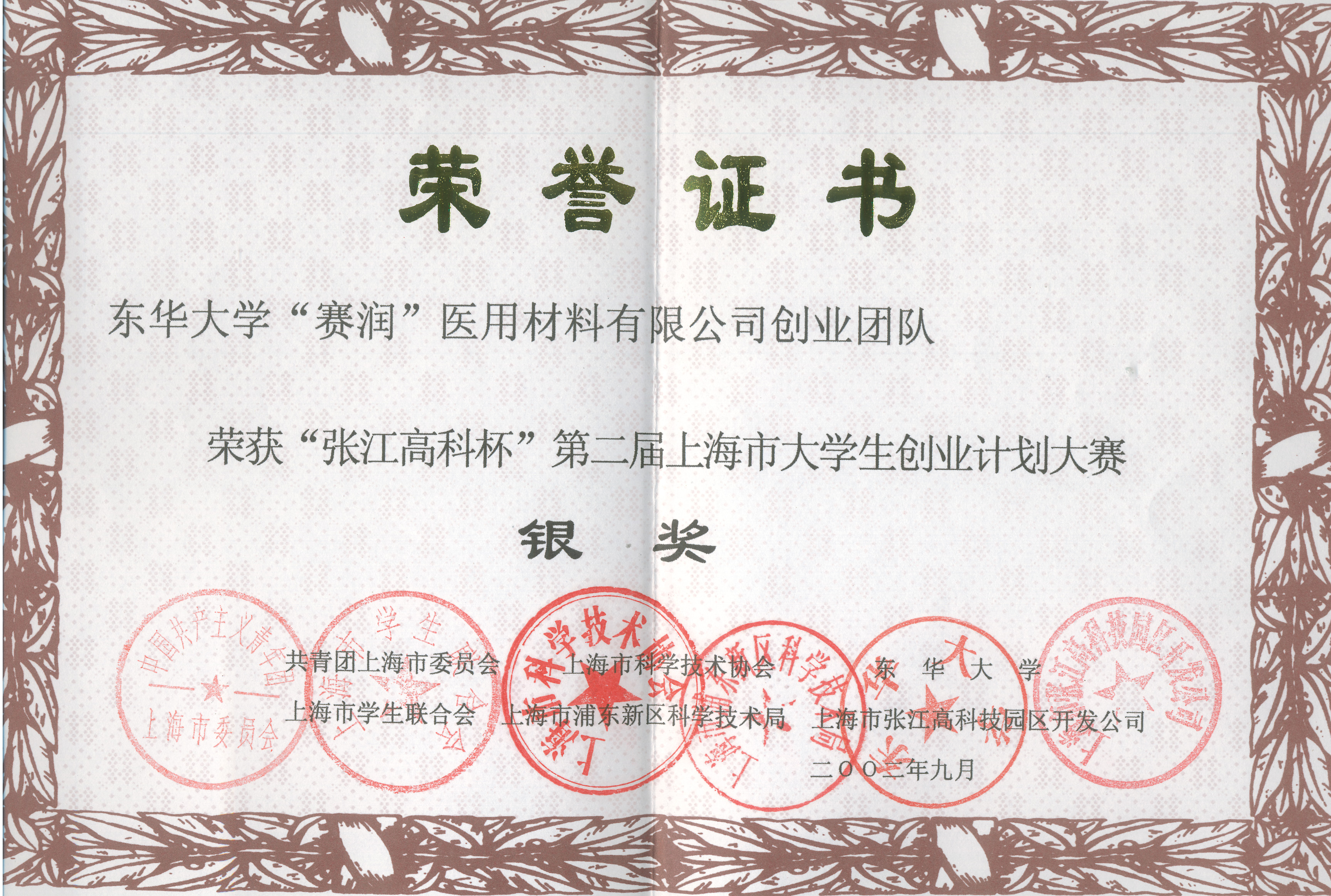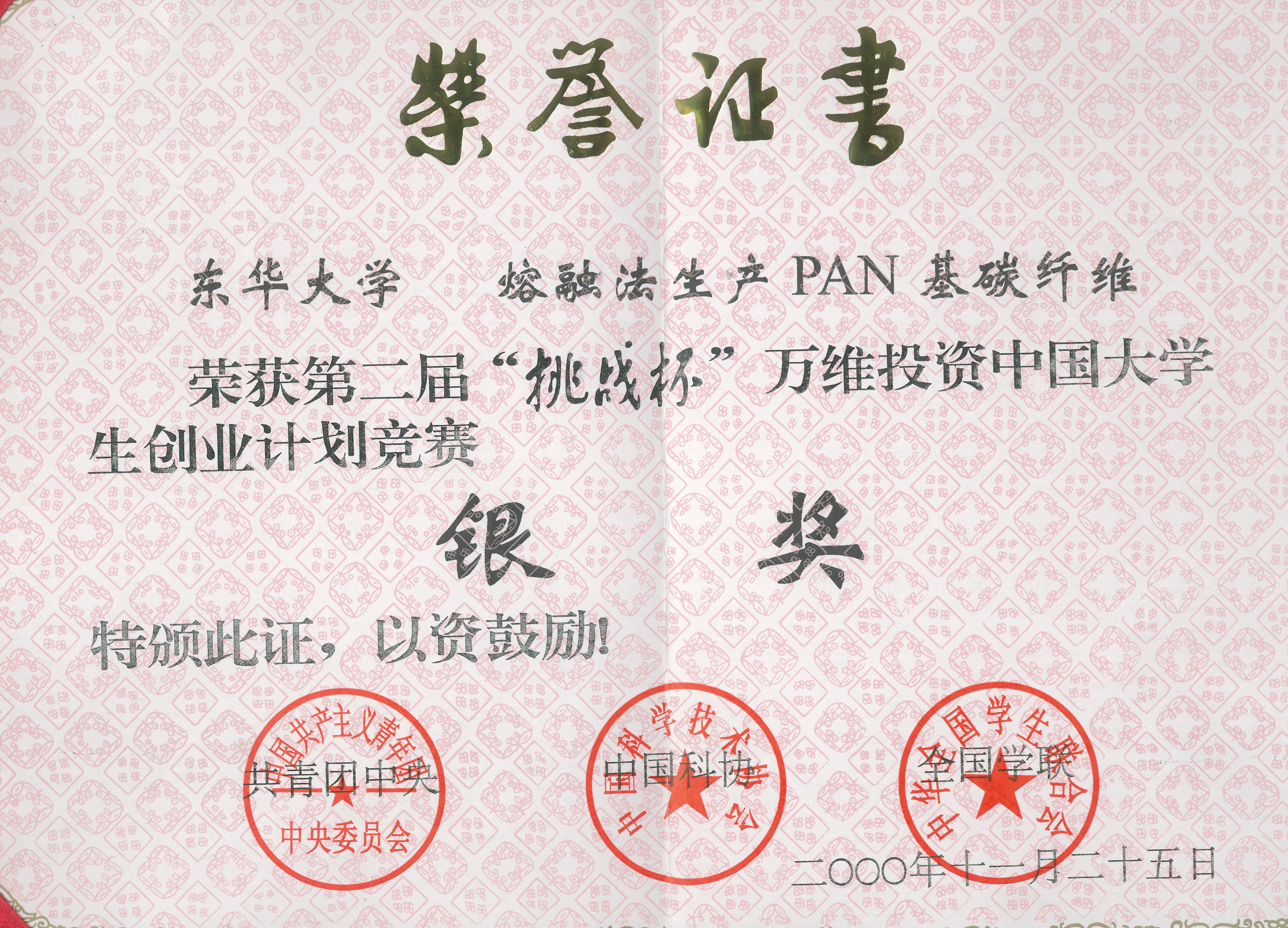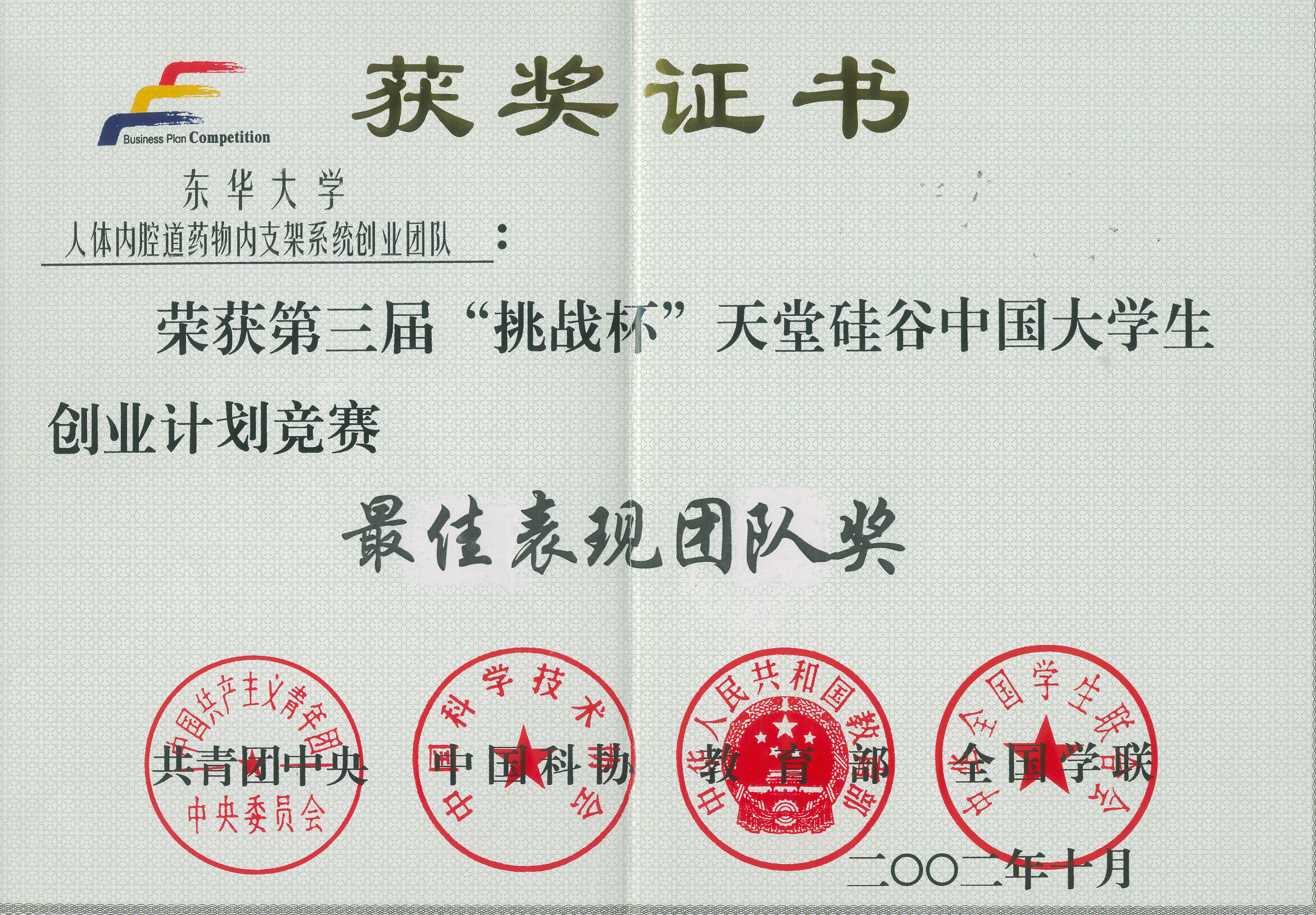 |  | 2003年,侯淼斌等同学的作品《对当前我国地方企业信用体系建设的实证性研究》获得第八届“挑战杯”全国大学生课外学术科技作品竞赛三等奖。 | |  | 2003年,“赛润”医用材料有限公司创业团队荣获“张江高科杯”第二届上海市大学生创业计划大赛银奖。 | |  | 2002年,赛润医用材料有限公司创业团队荣获第三届“挑战杯”天堂硅谷中国大学生创业计划竞赛铜奖。 | |  | 2002年,绿源草坪有限公司创业团队荣获第三届“挑战杯”天堂硅谷中国大学生创业计划竞赛金奖。 | |  | 2002年,“绿源草坪有限公司创业团队”荣获“张江高科杯”第二届上海市大学生创业计划大赛铜奖。 | |  | 2002年,人体内腔道药物内支架系统创业团队荣获第三届“挑战杯”天堂硅谷中国大学生创业计划竞赛最佳表现团队奖。 | |  | 2002年,“人体内腔道药物内支架系统”创业团队荣获第三届“挑战杯”天堂硅谷中国大学生创业计划竞赛金奖。 | |  | 2002年,“人体内腔道药物内支架系统”创业计划荣获“张江高科杯”第二届上海市大学生创业计划大赛金奖。 | |  | 2000年,“人工肾”——聚醚砜中空纤维透析器荣获第二届“挑战杯”万维投资中国大学生创业计划竞赛银奖。 | |  | 2000年,富光绿色照明有限责任公司(团队)荣获“张江杯”上海市大学生创业计划大赛金奖。 | |  | 2000年,熔融法生产PAN基碳纤维(团队)荣获“张江杯”上海市大学生创业计划大赛银奖。 | |  | 2000年,熔融法生产PAN基碳纤维荣获第二届“挑战杯”万维投资中国大学生创业计划竞赛银奖。 |