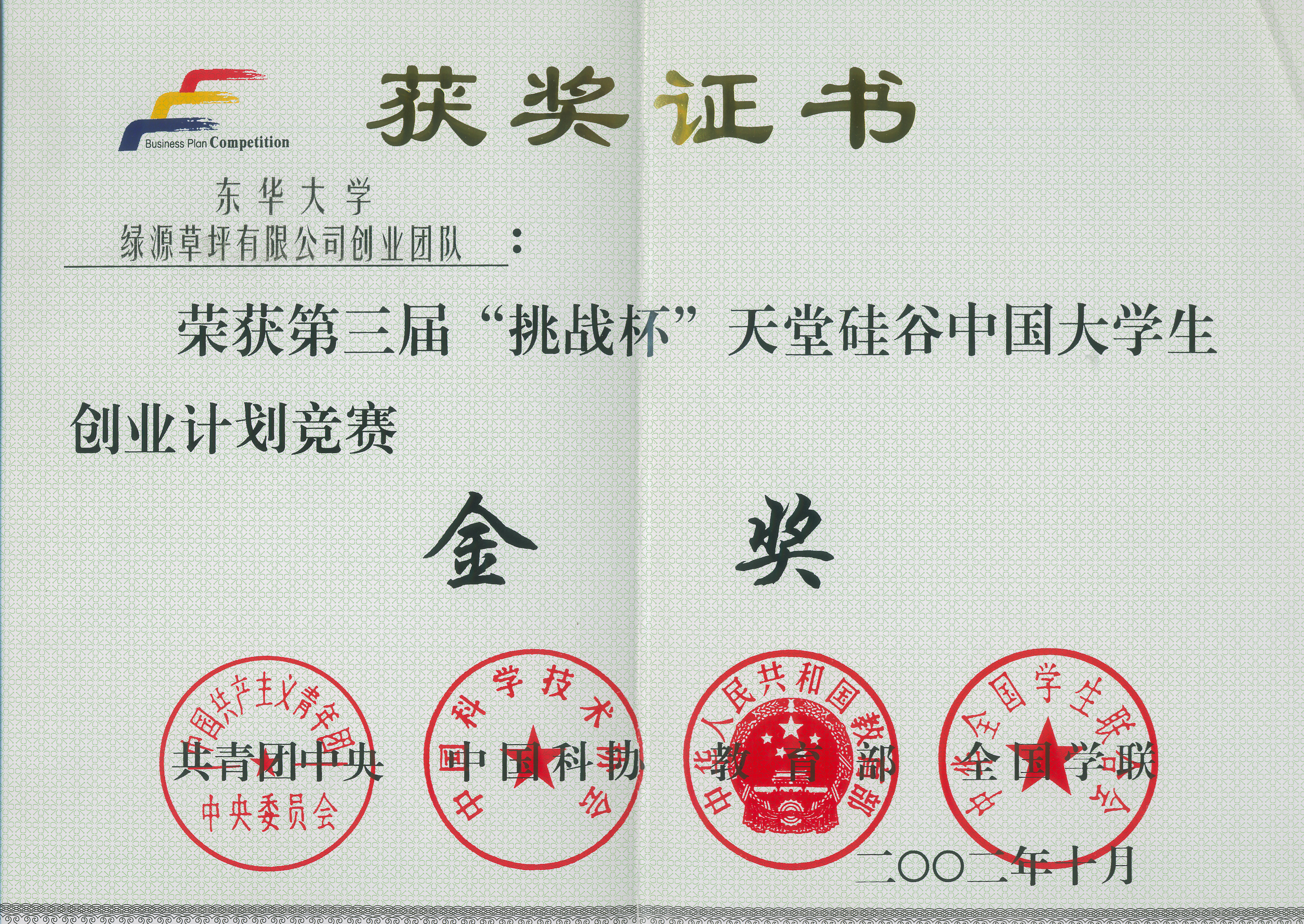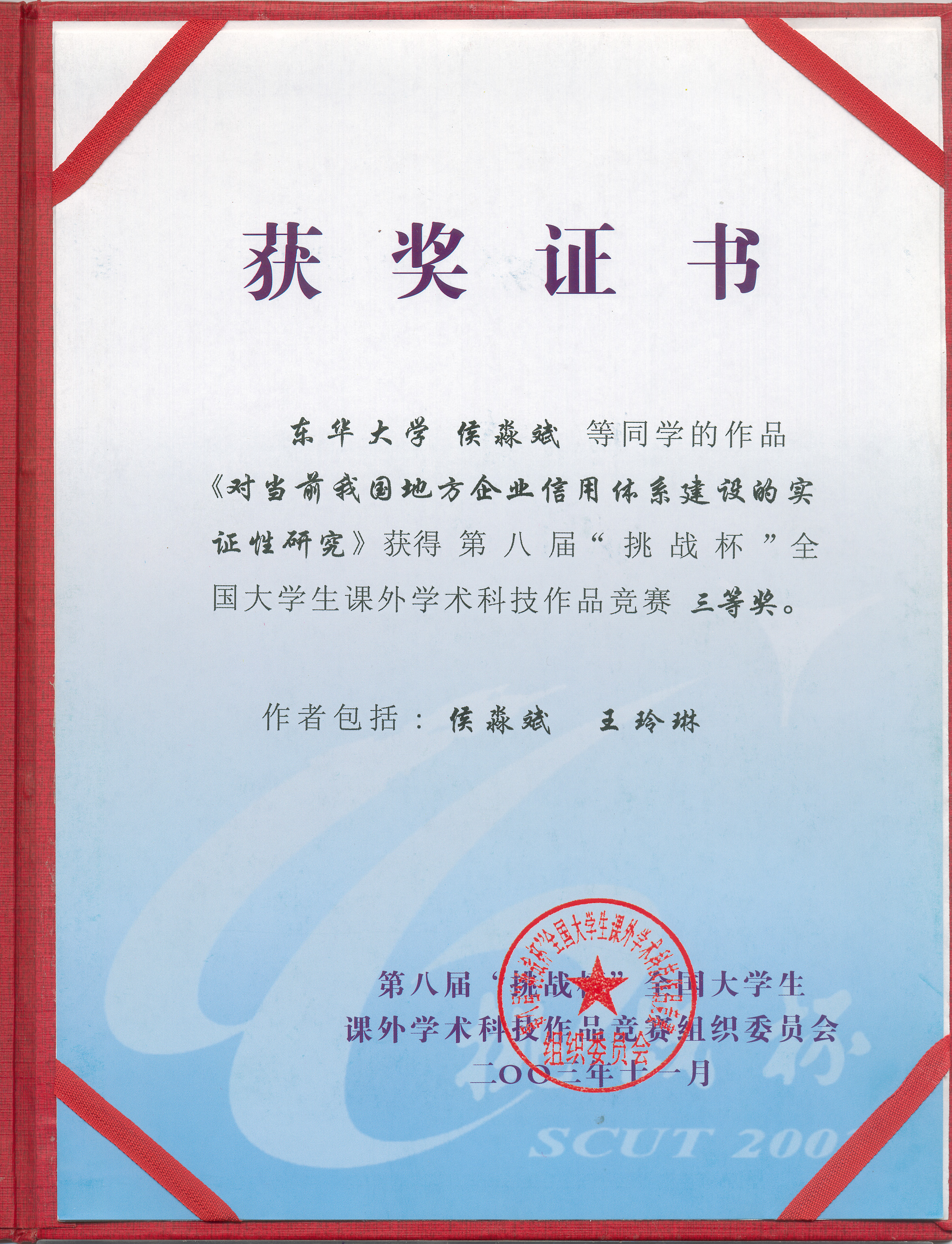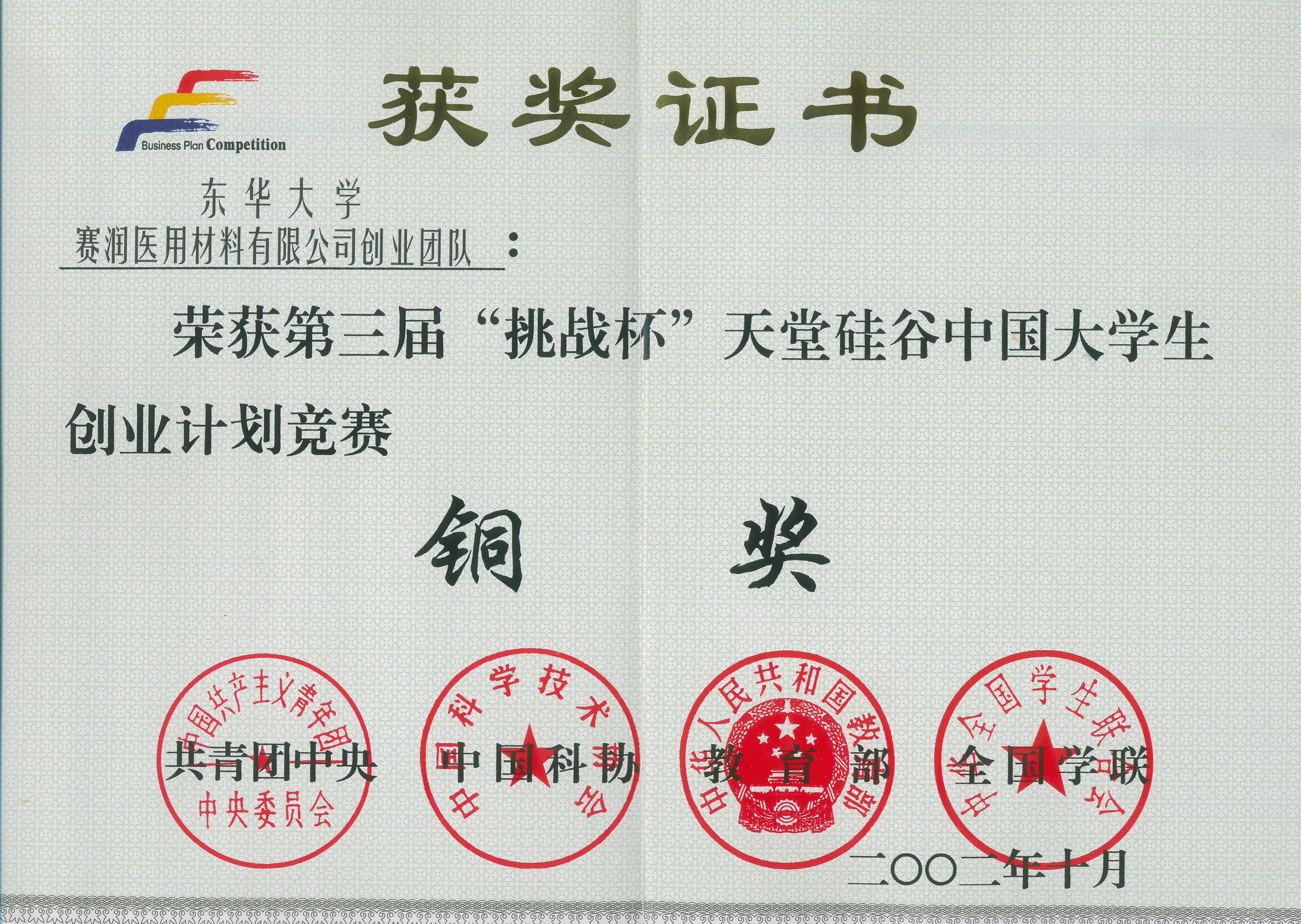 |  | 2003年,侯淼斌等同学的作品《对当前我国地方企业信用体系建设的实证性研究》获得第八届“挑战杯”全国大学生课外学术科技作品竞赛三等奖。 | |  | 2003年,“赛润”医用材料有限公司创业团队荣获“张江高科杯”第二届上海市大学生创业计划大赛银奖。 | |  | 2002年,赛润医用材料有限公司创业团队荣获第三届“挑战杯”天堂硅谷中国大学生创业计划竞赛铜奖。 | |  | 2002年,绿源草坪有限公司创业团队荣获第三届“挑战杯”天堂硅谷中国大学生创业计划竞赛金奖。 | |  | 2002年,“绿源草坪有限公司创业团队”荣获“张江高科杯”第二届上海市大学生创业计划大赛铜奖。 | |  | 2002年,人体内腔道药物内支架系统创业团队荣获第三届“挑战杯”天堂硅谷中国大学生创业计划竞赛最佳表现团队奖。 | |  | 2002年,“人体内腔道药物内支架系统”创业团队荣获第三届“挑战杯”天堂硅谷中国大学生创业计划竞赛金奖。 | |  | 2002年,“人体内腔道药物内支架系统”创业计划荣获“张江高科杯”第二届上海市大学生创业计划大赛金奖。 | |  | 2000年,“人工肾”——聚醚砜中空纤维透析器荣获第二届“挑战杯”万维投资中国大学生创业计划竞赛银奖。 | |  | 2000年,富光绿色照明有限责任公司(团队)荣获“张江杯”上海市大学生创业计划大赛金奖。 | |  | 2000年,熔融法生产PAN基碳纤维(团队)荣获“张江杯”上海市大学生创业计划大赛银奖。 | |  | 2000年,熔融法生产PAN基碳纤维荣获第二届“挑战杯”万维投资中国大学生创业计划竞赛银奖。 |