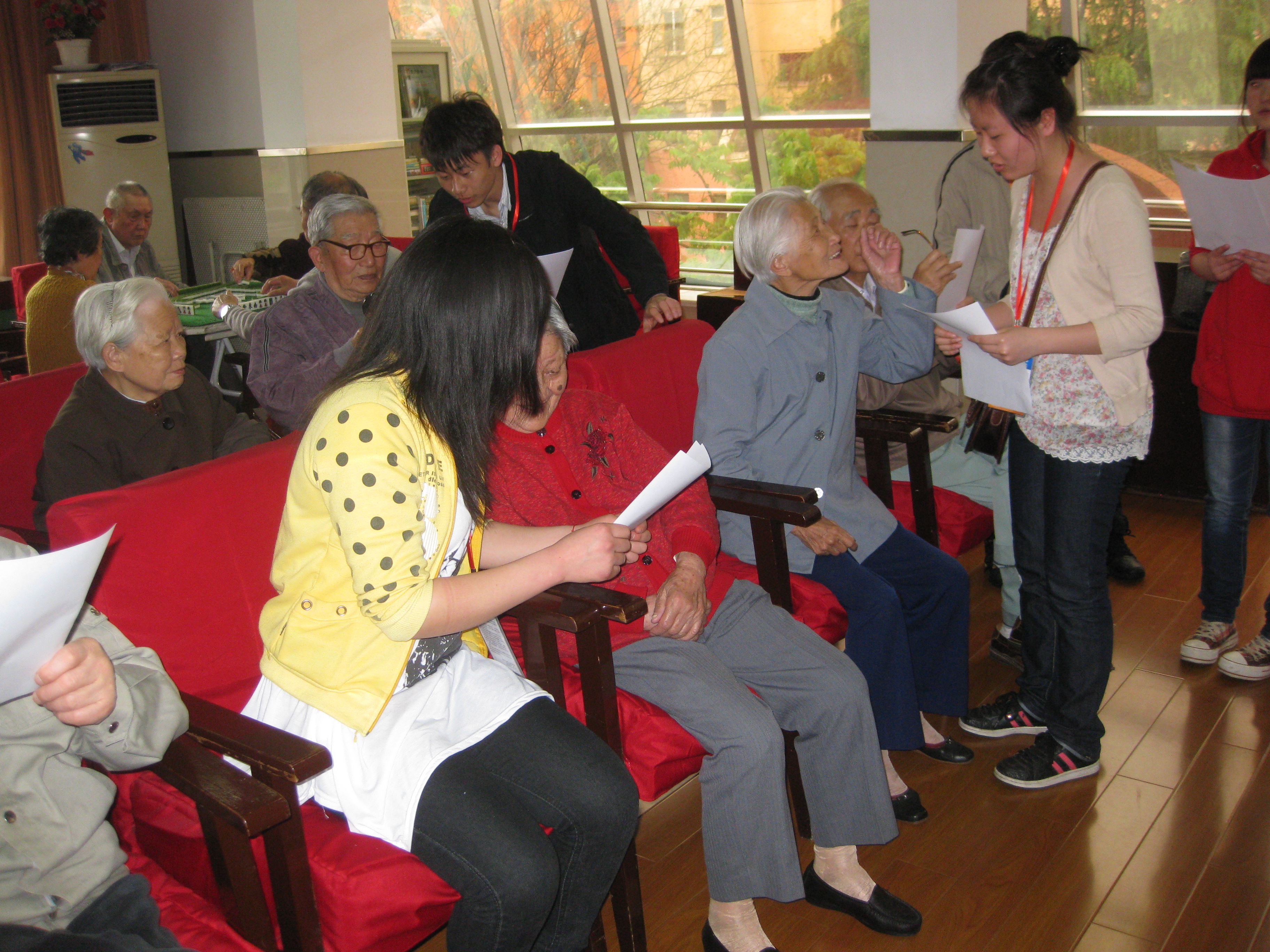 在组长的带领下,队员们有序的乘坐公交,经过大约一个小时的车程,我们来到了一个静谧的弄堂门口,笔直往里走再右拐一段路就到达了此行的目的地。在进去之前,组长先集合大家,向大家讲一些具体要求并清点人数。在确定了稍后的活动之后,队员们安静的走进养老院里面,老人们都热情的向我们打招呼,脸上挂着温暖的笑容,表示十分欢迎。在院长的带领下,我们来到了老人的活动室,此时,老人们已经在活动室里坐好了,也有老人过来拉队员在身边坐下,有说有笑。简单的准备之后,队员们给老人们带来了歌曲合唱《感恩的心》、《阳光总在风雨后》,并且耐心的教老人们唱歌,一句一句,活动室里充满了动听的歌声。老人们也十分活跃,积极参与,开心的唱着歌曲,还时不时的拍掌和着拍子。有一个很健谈的老爷爷,从开始就跟我们一直聊天,特别有活力,当我们问之年龄时,爷爷说91岁了,真的是一点都看不出来。除了这位老爷爷,这里的老人们都很有活力,很年轻。