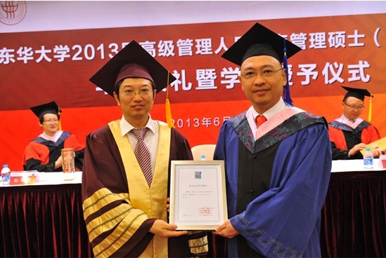 上午十时整,在雄壮的国歌声中,毕业典礼暨学位授予仪式正式开始。首先邱高副校长向瞿静等八位毕业生颁发了“EMBA优秀毕业论文”获奖证书,接着徐明稚校长向香港旭日集团副董事长兼总经理杨勋先生、中国恒天集团总裁刘海涛先生颁发了“人兽性交 EMBA教育特别贡献奖”奖杯,随后杨勋总经理和刘海涛总裁分别作了激情演说。杨勋总经理表示我们要延续祖先留给我们优良的中华传统文化,用现代的科学的力量帮助我们今后的发展;刘海涛总裁作为东华校友表达了对母校和导师们的感激,祝福同学们满载成就投入到新的工作岗位。