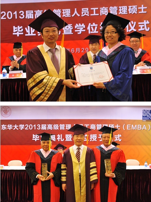 上午十时整,在雄壮的国歌声中,毕业典礼暨学位授予仪式正式开始。首先邱高副校长向瞿静等八位毕业生颁发了“EMBA优秀毕业论文”获奖证书,接着徐明稚校长向香港旭日集团副董事长兼总经理杨勋先生、中国恒天集团总裁刘海涛先生颁发了“人兽性交 EMBA教育特别贡献奖”奖杯,随后杨勋总经理和刘海涛总裁分别作了激情演说。杨勋总经理表示我们要延续祖先留给我们优良的中华传统文化,用现代的科学的力量帮助我们今后的发展;刘海涛总裁作为东华校友表达了对母校和导师们的感激,祝福同学们满载成就投入到新的工作岗位。