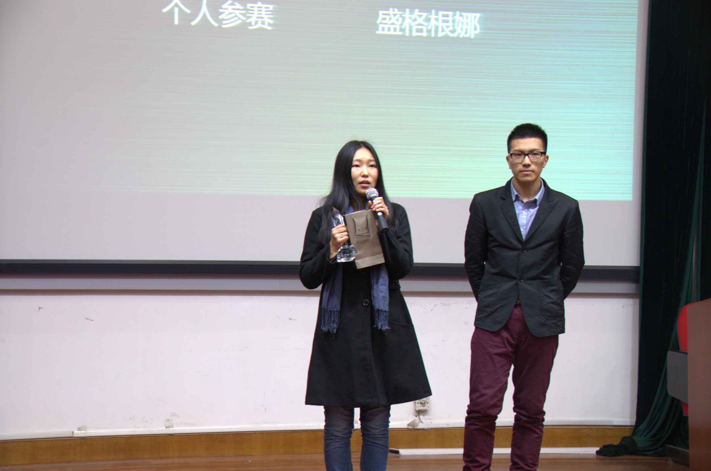 活动开始用一段以全球各大电影公司及电影节为素材的串联视频将全场引入电影世界,颁奖典礼在这种绚丽奇妙的氛围中拉开了帷幕。三位老师进行致词,对参赛同学给与了鼓励,同时表现出对大赛评选作品充满了期待与信心。经过前期组委会的评审,《青春game》《时光不老,我们不散》《One Day》《不落幕的青春》《成长的代价》等作品均成功入围。首先颁布最佳男女演员,最佳男演员获奖者是来自会计1301《不落幕的青春》的徐缘,最佳女演员获奖者是来自个人参赛《时光不老,我们不散》的盛格根娜,在其后最佳导演中盛格根娜再次获奖,最佳后期是来自经济1301蔡玉娇凭借《青春game》夺得。前四项个人大奖颁布完毕后,十大复赛入围歌手黄文婷为大家演唱了王若琳的《i love you》,赢得现场一片掌声。在这短暂歇息后,活动马不停蹄的开始了人气奖与最佳微电影奖项的公布。根据网络投票结果,管科1301《我的青春有你相伴》摘得此最佳人气桂冠;而后根据评委评鉴,《时光不老,我们不散》《One Day》《青春game》三部作品入围最佳微电影提名,三部影片在现场放送后,现场的观影者们化身大众评委与老师们一同参与最佳微电影奖的投票打分,根据最后投票分数,最终确定《青春GAME》获得本届最佳微电影殊荣。