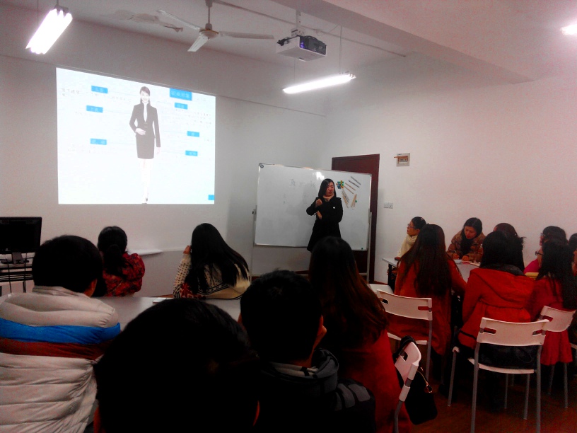 班会主要分为两部分,第一部分是主讲礼仪规范。高加加老师将职场礼仪细化到很多具体的方面,从基本职业着装、站坐姿、介绍、握手、接打电话到用餐的座位等等一系列日常职场中每个人都会遇到的点滴小事。 其中,通过同学之间情景表演所表现出的问题,老师加以指导,使得原本枯燥无味的礼仪知识变得活灵活现,让我们真切的感觉到礼仪在职场甚至生活中的重要性,并且能够对其中的重点印象深刻。而由有相关知识的同学主讲更是将班会推向一个高潮,同龄人之间的讲述更能引起同学的注意及思想上的共鸣。