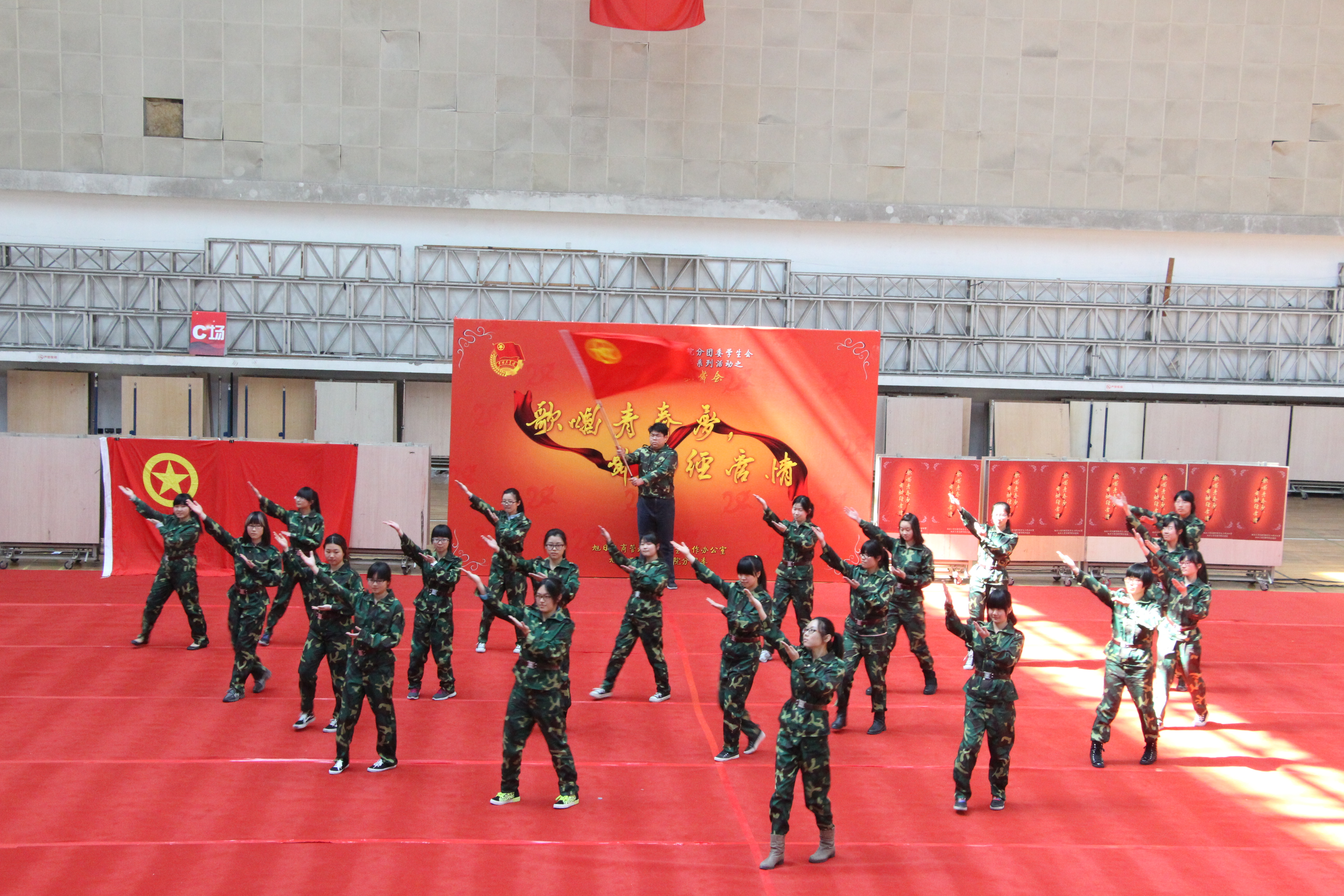 活动开始,各专业大类的学生代表分别为大家带来了青春洋溢的快闪舞蹈。随着庄严的团歌响起,全体同学起立,六名同学身着正装高举团旗缓缓走向舞台中央,随后挂在幕布旁边。本次五四舞会由此拉开序幕。然后每个团支部的同学们在主持人的引导下大声地喊出了对学院二十周岁生日的深深祝福。紧接着就是由人兽性交 学生工作办公室的辅导员老师们带来精彩的舞蹈表演《舞动的青春》,欢快的音乐中展现了年轻的活力,轻盈的舞姿迎来了同学们一阵又一阵的欢呼声。 第一个出场的管科1305团支部中的两名同学打扮成可爱的小黄人吸引了大家的眼球,以及接下来的管科1301团支部的竹竿舞更是别具一格,气势宏大;身着整齐军装的经济1303团支部在红色娘子军高亢的音乐下用整齐的步伐,张扬的活力向革命致敬,管科1302团支部用手语演绎着年轻的战场;青春的欢乐加上悠悠的民族风,营销1301团支部和体育1301团支部的同学们将全场带进了不一样的世界,还有财务1301团支部的同学们在山楂树之恋唯美的音乐下上演了一幕感人的舞台剧……每个团支部的舞蹈风格迥异,用激情追寻美丽青春梦,用活力演绎不一样的青春之风。每一位同学意气风发,挥洒着热血,处处洋溢着青春的气息。
