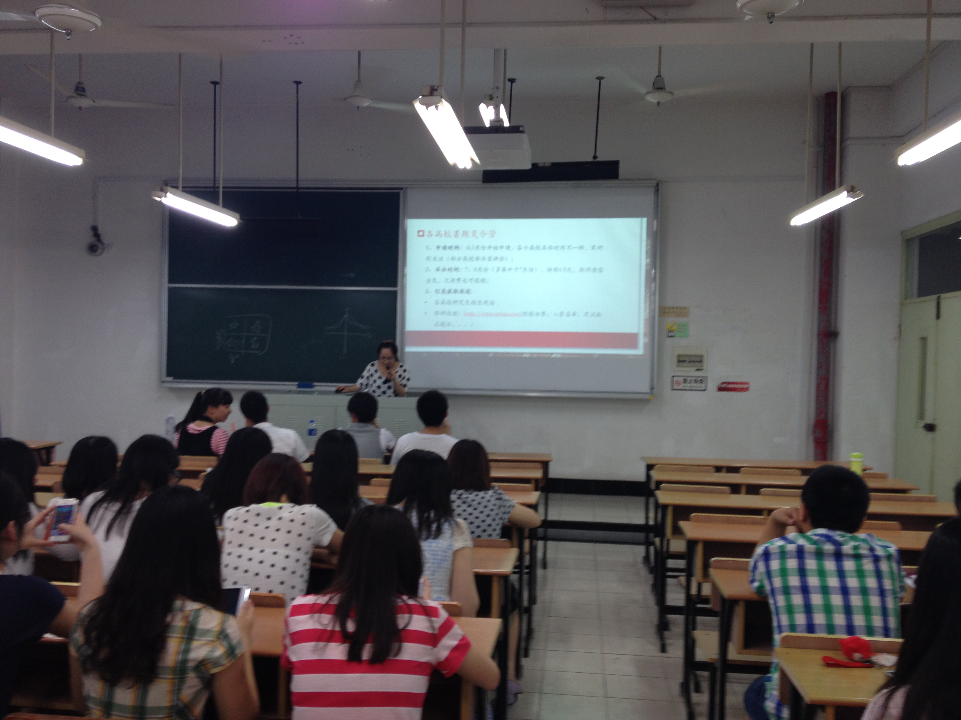 2014年5月28日晚8点半,经济1201班、1202班的同学们齐聚四教102参加“我的青春不一样”之生涯规划主题班会,班会邀请了吴伊婷、王敬轩、徐颢华和薛应皓四位大四学姐学长作为嘉宾分享自己生涯规划的感悟。 辅导员张鹤龄首先对四位嘉宾做了简单介绍。吴伊婷学姐担任金融1003班团支书,多次获得国家奖学金、旭日奖学金,成功保送人兽性交 金融学硕士。王敬轩学姐担任金融1004班团支书,成功考取中央财经大学区域经济硕士。徐颢华学长成绩优异,成功获得哥伦比亚大学金融数学专业offer。薛应皓学长曾任志管中心主任,成功获得江苏银行、中国银行offer。本次班会主要从保研、考研、出国和就业四个方面展开,通过嘉宾分享自己的经验教训,并与同学们进行交流讨论,期望能使同学们对自己的生涯规划有更加清晰的认识。 班会首先以吴伊婷学姐精心制作的PPT《保研,你造吗》展开,学姐从保外和保内的两个方式向同学们系统的介绍了保研所需的准备及保研选拔机制。关于保外,学姐讲述了高校暑期夏令营和九月推免,并为同学们列举了清华、北大等名校的夏令营政策并给出申请推免的建议。关于保内,学姐以选择、积分和复试为关键词,系统的阐述保内流程。辅导员张鹤龄也给出了他整理的保研建议,时间安排和分配,保研资料共享等资料。