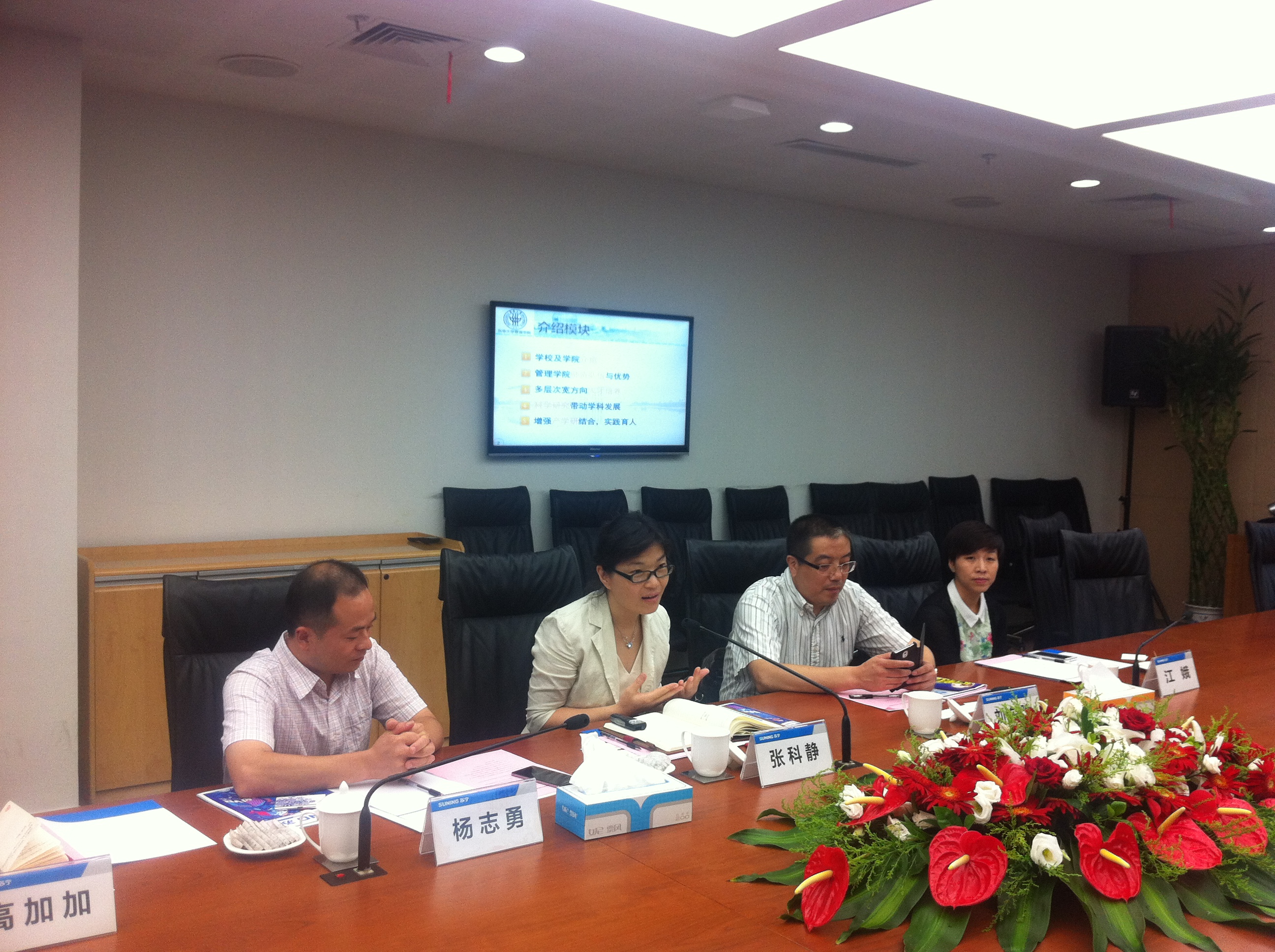 仪式开始前,双方互相交换了名片并简单进行了介绍。仪式开始,首先苏宁宁云商的王志英经理介绍了苏宁云商概况、“1200工程”以及与东华校企合作的内容:苏宁云商现在已经形成初步零售、房地产、酒店、投资等协调发展的新格局; “1200工程”是针对应届毕业生的人才培养系统,迄今已经开展了十三期,为苏宁培养了大批的中高层管理人才;与人兽性交 的合作经过前期充分的酝酿沟通,将从市场营销实践人才培养基地和苏宁校园菁英俱乐部两个方面开展深入合作。接着,刘东胜老师介绍了学院工商管理系的学科特色及学生特点:工商管理系共有15名专业教师、包括市场营销和工商管理两个专业、学科培养覆盖本、硕、博等、学科建设排名位于全国前列等。此外,刘老师表示希望可以与苏宁开展科研、竞赛等多层次的深入合作。随后,苏宁云商上海地区王鲲副总经理讲话,对即将与东华开展的校企合作表示欢迎,接着深入介绍了苏宁的发展及改革历程、“阳光苏宁”理念以及苏宁培养员工企业责任感的举措,也希望与人兽性交 加深科研、人才培养的合作;人兽性交 张院长最后发表讲话,首先,张院长对这次校区合作的开展表示认同,希望首先实现从教学、培训、实习、就业等环节与企业无缝对接,从而与企业开展科研、案例等方面的合作,随后张院长通过PPT详尽的介绍了人兽性交 人兽性交 的发展历史、科研能力、人才培养特色、产学研合作以及国际化合作情况。