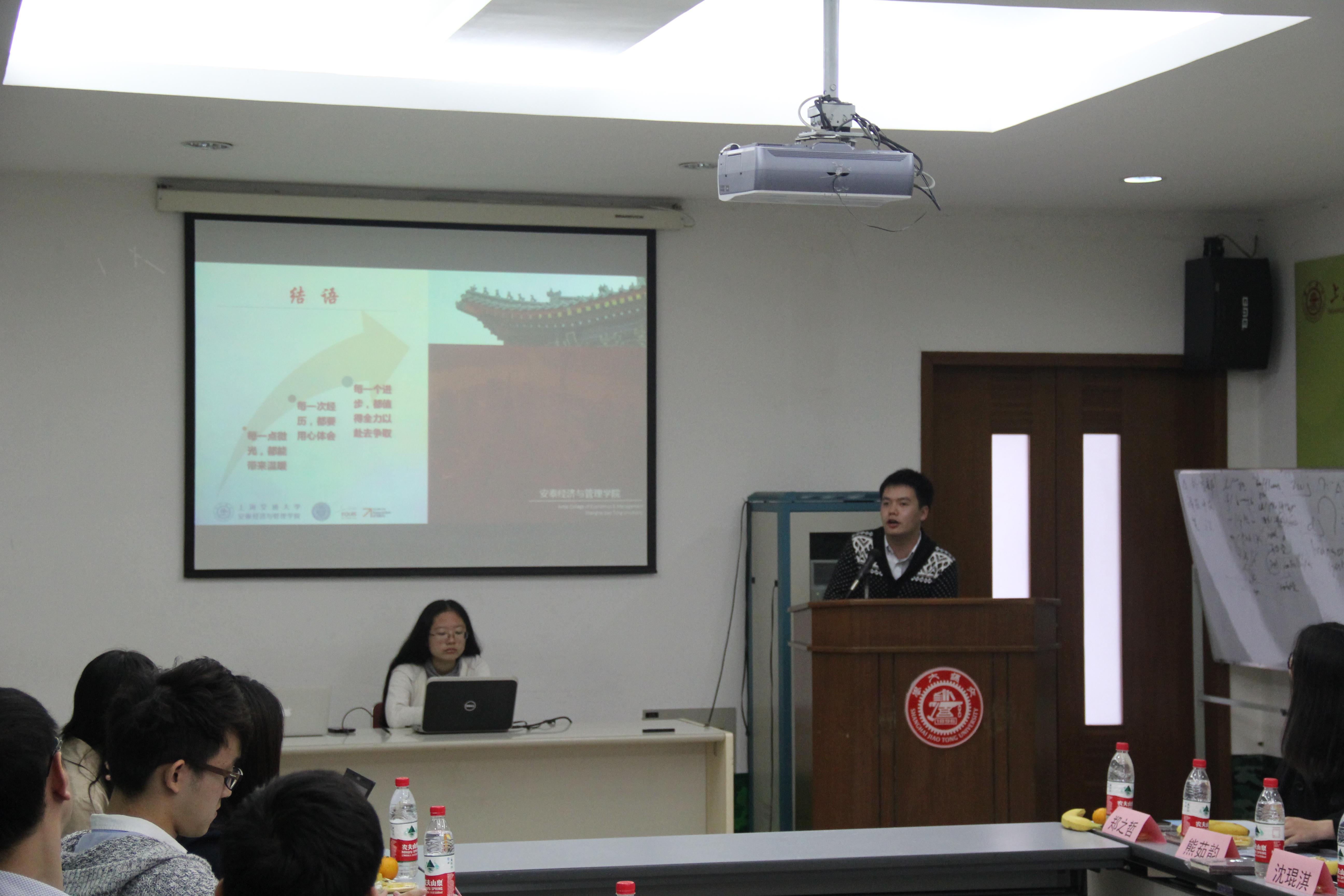 上午九点五十许,在上海交通大学闵行校区逸夫科技楼208,交流活动正式开始。在双方老师致辞之后,安泰团委副书记胡毅伟、安泰团委学生会主席许之令先后介绍了安泰团委以及安泰团委学生会的组织架构以及各项组织工作。接着,安泰经管学院的袁芊同学展示介绍了刚刚获得“创青春”全国大学生创业大赛公益创业赛金奖的“海角公益”项目。安泰经济与人兽性交 的介绍结束,人兽性交 学生会主席赵晓彤上台介绍东华管院学生会的特色活动、组织架构、制度建设以及其他工作内容。展示环节结束,两院的学生干部开始自由交流,谈及包括科学商店建设、跨校交流、传统纸质媒体以及新媒体建设等多个问题。