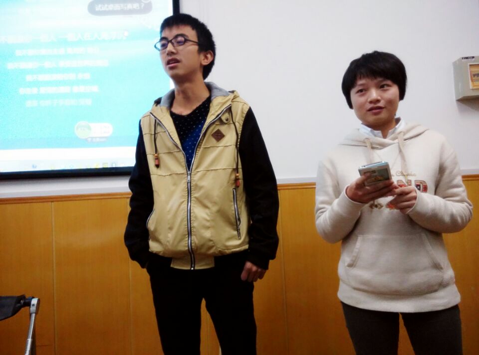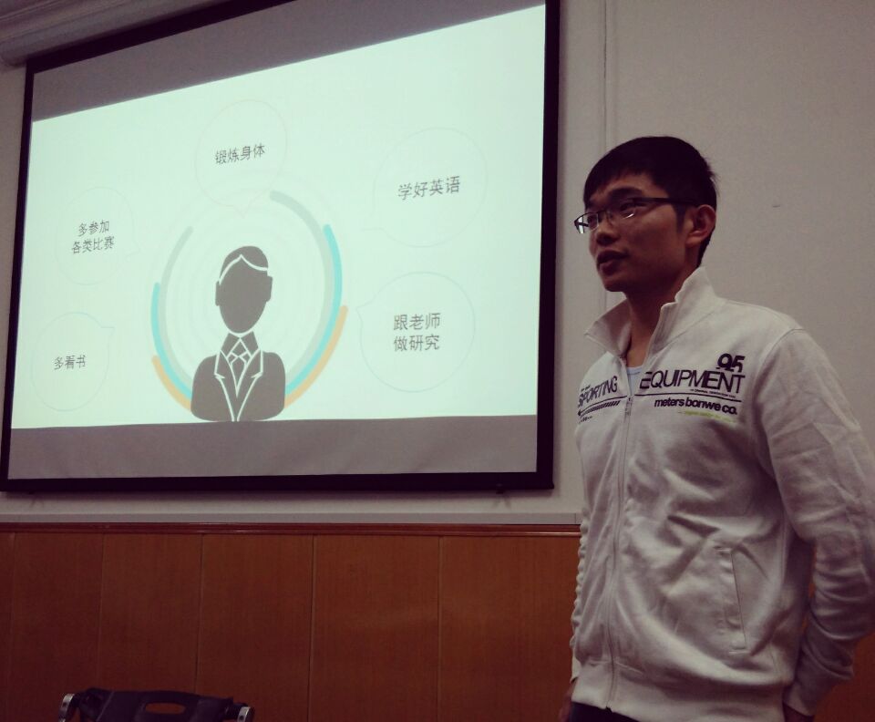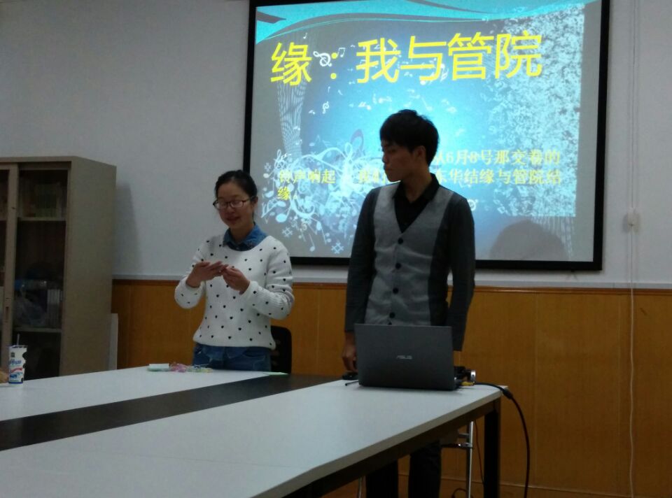 随后两位“特邀嘉宾”单独上台发言把气氛推向高潮。首先,同样来自管院,11届会展经济与管理的程帅学长向我们介绍了他总结出的大学学习与生活的经验。他说出自己大学生活中的满意与遗憾与他的两位曾经成绩优异却因游戏荒废学业的同学失败的例子,由此引出“学习永远是第一位”与“要适度玩游戏”的忠告。除此之外,他告诉我们大学里不只要学书本上的知识,还要学会与人交往,做事更要学会“靠谱”,这样才算是真正的成熟。之后我们班级的辅导员吴娅琳老师总结了从开学到现在同学们的优秀与不足,带领同学们们眺望未来。话语里饱含了对同学们的期待与激励。