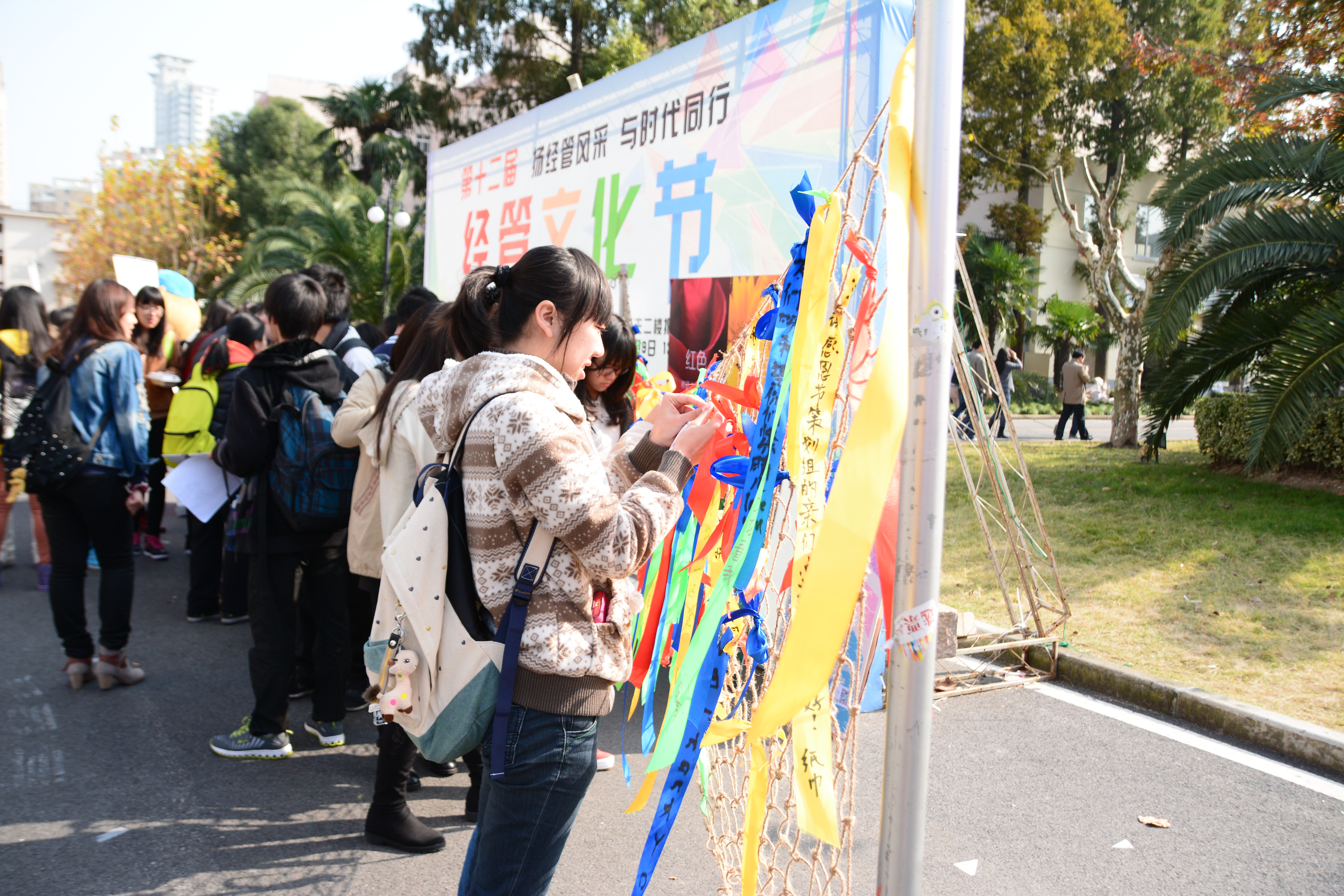 管院志管为同学们准备了各色的丝带,红色代表希望,生命与和平;绿色代表健康,快乐和信念;黄色代表祈福,愿心中的你平安归来;蓝色代表你是我心里最重要的人。管院志管的干事们在摆摊现场的旁边放置了一个大的网,供写好的同学将丝带挂在上面。