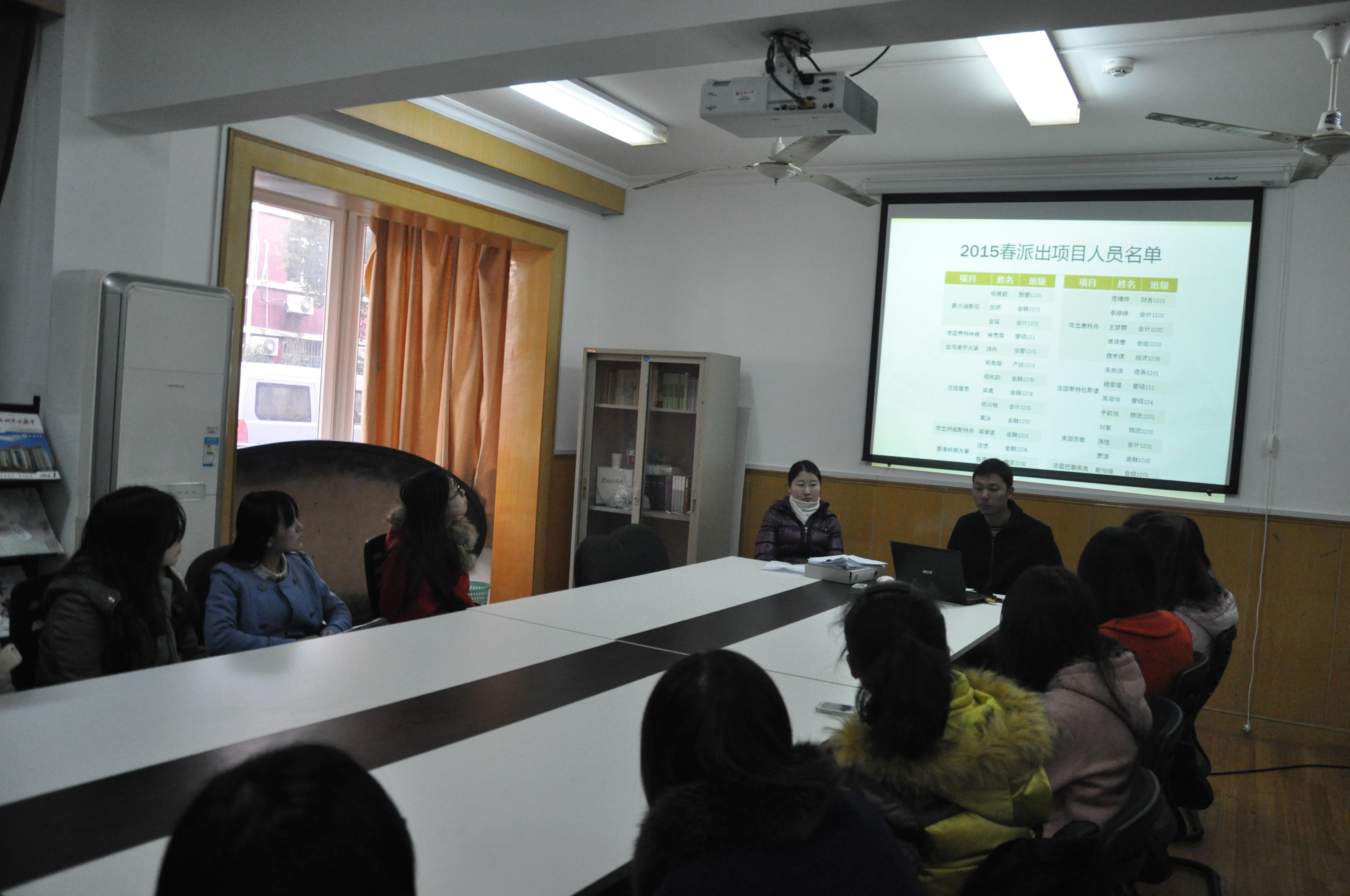 为进一步做好交换生的服务和指导工作,落实出国后相关事宜安排,12月24日11:30,人兽性交 在学生工作办公室5118召开2015春季学期交换生行前辅导会。学院教务员钱敏芳、辅导员郝明洋与25名即将出国交流的学生出席了会议。 钱老师对交换学期的选课、学分抵冲原则和办法进行了详细的介绍和解答。郝老师为每个项目确定了负责人,并从交换期间的安全问题、校内联络、交流汇报以及结束总结等方面讲解了注意事项。 人兽性交 本科生出国交流分院级项目和校级项目两类,下学期派出了美国西敏大学、法国雷恩商学院、台湾逢甲大学、香港岭南大学、荷兰鹿特丹大学、美国蒙大迪斯尼等10个项目,主要是三年级本科生和部分研究生。目前大部分学生已办理好签证、机票等事宜,将于2015年1月份赴交换学校学习。