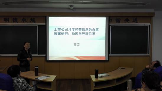 4月21日下午1:30,我院第二期青年教师优秀学术成果交流会在旭日楼306如期举行。交流会由张丹教授主持,主讲人为高芳老师和吴炯教授。高芳老师的学术交流以“上市公司月度经营信息的自愿披露研究:动因与经济后果”为主题,吴炯教授以“家族企业传承中社会资本的代际调试——基于海鑫集团案例的研究”为主题。我院张丹、贺卫、郑斐峰、刘东胜、曾月明、马彪等老师和研究生参加了此次讲座。 高芳老师首先从上市公司信息披露问题谈起,引出信息披露的理论基础以及研究的对象、重点和研究的意义。接着是信息披露的动因分析,包括融资需求、同行披露、经营周期几个方面。最后以股票市场和权益资本成本为例,向我院师生分析了信息披露的经济后果。
