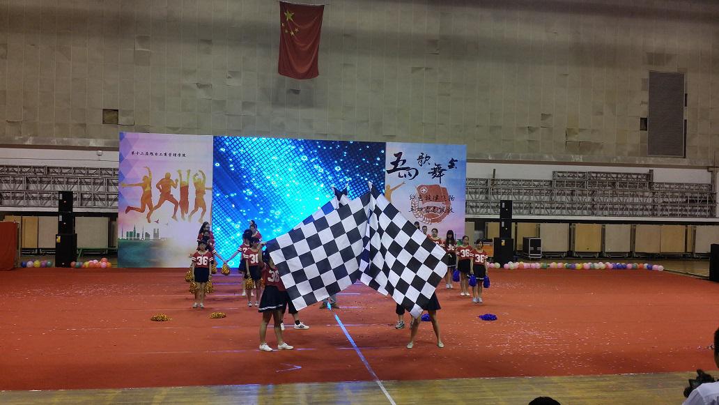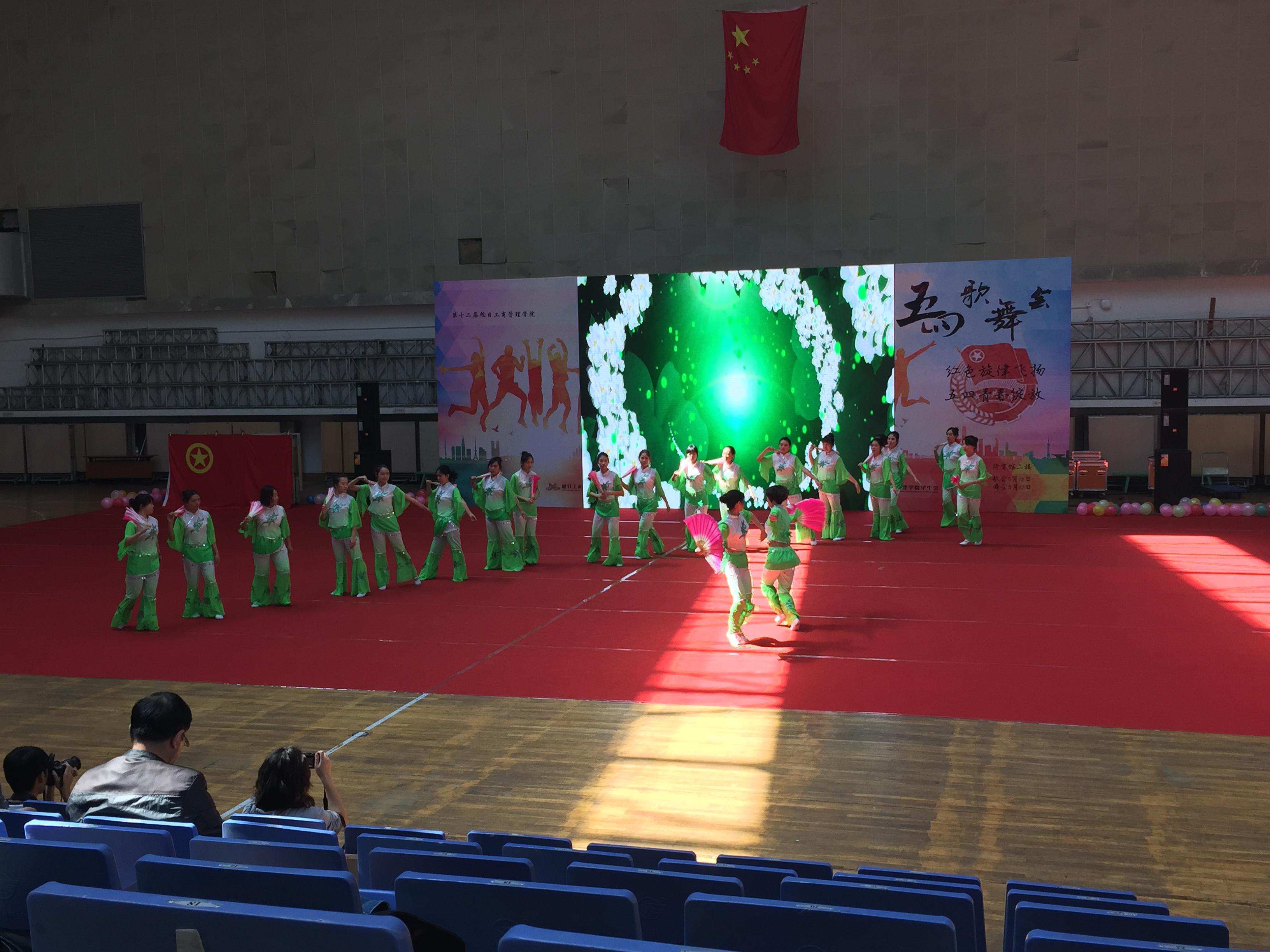 会计1402班黑白配的衣服显得无比整齐;管科1402班的舞蹈更是别具一格,背影妖娆多姿;身着短裙的会经1401的女生更是让现场画风突变;三个节目之后,辅导员带来了表演“奔跑吧辅导员”,欢快的音乐、轻盈的舞姿让同学们感受到了辅导员们的青春活力,迎来了同学们一阵又一阵的欢呼声。经济1403则带来了震撼的扇子舞表演,轻盈的舞姿让现场观众大饱眼福……每个班的舞蹈风格迥异,用激情追寻美丽青春梦,用活力演绎不一样的青春之风。每一位同学意气风发,挥洒着热血,洋溢着青春的气息。 晚上的五四舞会中,物流1301展示他们的歌曲《相亲相爱》;管硕141和144两个班级携手带来的歌曲《站起来》;旅游1301用《龙的传人》与舞龙表演震撼了全场……中场休息的时候,主持人请上了曾获得校园好声音华东赛区一等奖的宿管部陈月萍老师,一曲《花儿为什么这样红》瞬间征服了在座的每一个观众,掌声经久不息。