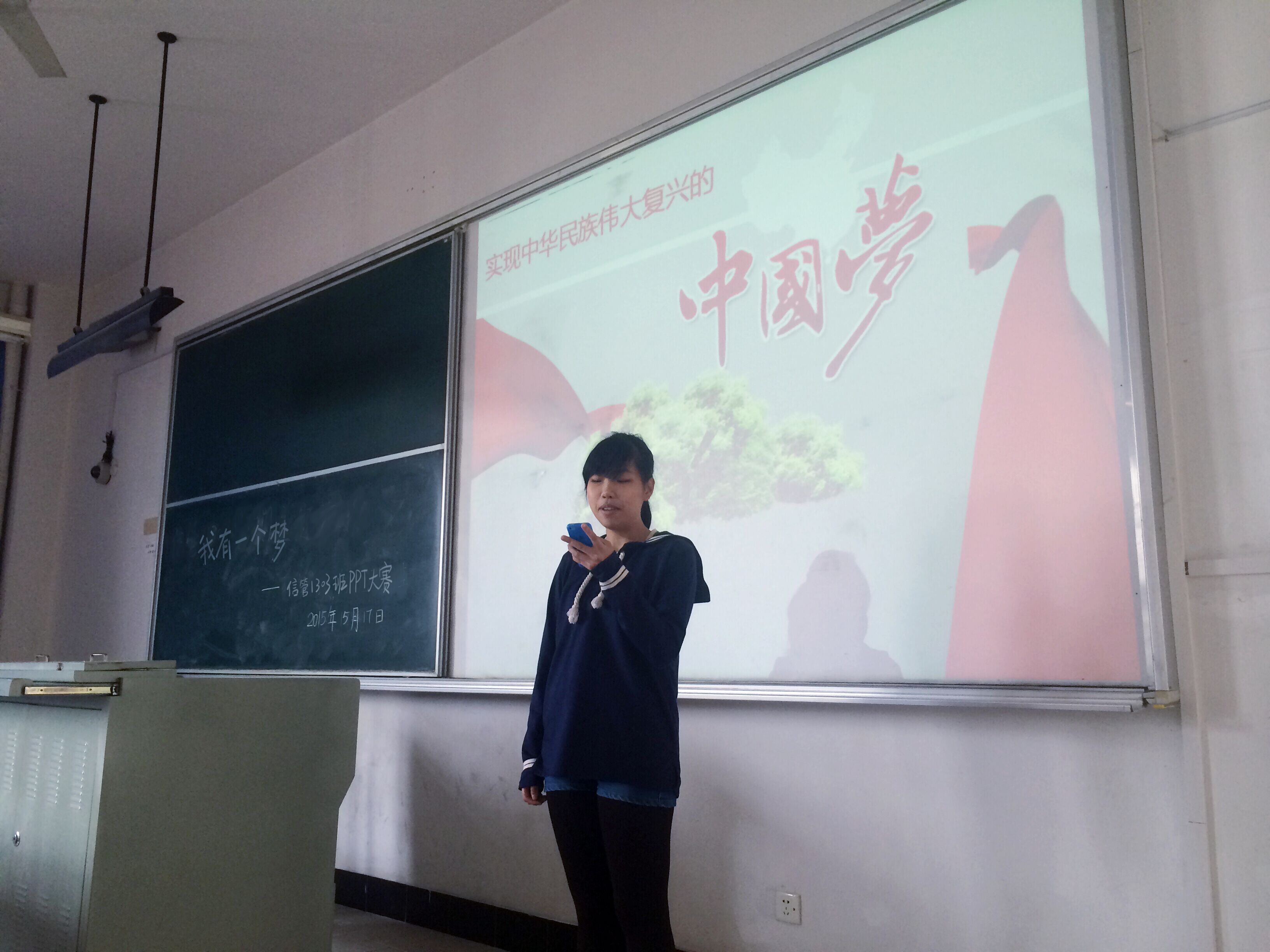 在连续几天的阴雨之后,上海迎来了一个阳光明媚的午后。2015年5月19日晚,带着愉悦的心情,信管1303班全体同学在延安西路校区4教210举办了“我有一个梦”——信管1303班主题PPT大赛,畅聊我的梦——大学梦,青春梦,中国梦。同学们用高超的PPT制作技巧和激情澎湃的演说为我们带来了一场技术与思想碰撞的盛宴。