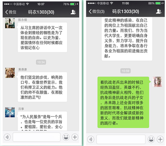 铭记历史提升民族凝聚力,科学奋斗致力振兴中华邦 ——信管1303纪念抗日战争胜利70周年线上交流活动通讯稿 2015年9月3日上午8:30至12:00,信管1303的同学们在班级微信群里开展了 “铭记历史,拥抱未来”——纪念抗日战争胜利70周年线上交流活动,同学们一边看着阅兵直播,一边发表着自己的看法与心声,思想火花迸射,气氛活跃。 上午8:30,李齐同学在班级群里号召大家一起参与“铭记历史,拥抱未来”——纪念抗日战争胜利70周年线上交流活动,得到同学们的热烈回应。9:00国家领导人习近平会携夫人迎候各国嘉宾,但同学们已经早早等待在各种屏幕前,期待着阅兵仪式的开始,有的同学还在返校的路上,无法观看视频直播,便通过网络渠道观看文字直播,不愿错过这激动人心的一刻。上午10:00,纪念大会正式开始,群里的讨论愈发热烈。当礼炮响起,庆祝着中国人民抗日战争70周年纪念活动正式开始,礼炮先烈而鸣、为胜利而鸣!国旗护卫队从英雄纪念碑沿中轴线正步行进到国旗杆处,黄鼎康同学流露出对护旗手的崇敬与羡慕:“他们坚定的步伐,响亮的口号,在像世界宣示,我们有捍卫正义的能力。他们的帅不在颜值,在那股凛然的正气!。”入党积极分子赵梦竹同学更加坚定了心中对党不断靠拢的决心,发表了“为人民服务是每一个兵,也是每一位党员的宗旨。爱祖国,爱社会,全心全意为人民服务。”紧接着,国家主席习近平发表重要讲话,铭记先烈,肯定了中华人民70年来的艰苦奋斗,坚定了我国继续向着目标奋勇前进和维护世界和平的决心,呼吁铭记历史,缅怀先烈,珍爱和平,开创未来!陈永熠同学道出心声:“从习主席的讲话中又一次体会到曾经的牺牲是为了现在的自由。以史为鉴,爱国情怀在任何时候都应该铭记在心。”10:30,阅兵仪式的开始将群里的讨论推向了高潮,听着那一句句浑厚而熟悉的“同志们好,同志们辛苦了!”,李齐同学满怀激动地说:“‘同志们好,同志们辛苦了!’短短两句却浓缩了亿万同胞对抗日战争胜利70年来重建家园,在富强民主文明和谐道路上前进的自豪,以及对繁荣富强未来的愿景,更是一代代军人为世界和平奉献的奏歌。”今日微博上的一句“知道为什么今年反法西斯70周年要搞的这么隆重吗,因为可能下一个十周年就没有老兵了”触动了亿亿万同胞的泪点,当抗战老兵方队出现时,一位老兵难抑心中万千心情抹泪的场景让群里的同学鼻酸眼热,感动与崇敬交织却难以言语,直到老兵子女方队驶入时,李齐同学才打破群里的沉寂:“看抗战老兵出来的时候已经热泪盈狂,英雄不朽,抗战精神薪火相传,他们的身后是抗战老兵的子女,未来路上还会面对很多的困苦艰难,抗战精神在新的时代将会解读成新的意义,而我们就是新精神的践行者。”看着屏幕上整齐划一的队伍,陈永熠同学发出心声:“这些挺拔刚毅的军人们此时此刻正在向祖国、向世界展示着他们的生命力和爱国热情。而其他人,在祖国其他岗位的人,也应受此精神的感染,在自己的岗位上为祖国献出自己的力量。而我们,作为当代大学生,更要明确自身义务,努力学习,提升自身能力,将来争取在各行各业为祖国的前进做出贡献。”