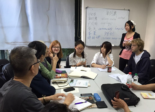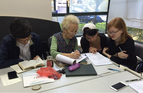 接下来就到了上课时间,老人们和志愿者们分成两组进行角色扮演。其中一位退休教师——甘老师,谦虚地称志愿者为“老师”,并让志愿者纠正大家的发音。每次“老师”做完示范,甘老师都不禁称赞志愿者的发音好听,眼间神采颇像个求知若渴的孩童。为了与留学生共同进步,志愿者还特地用中文再次讲解,耐心地为他们逐字逐句地纠正错误,阵阵读书声悦耳动人。