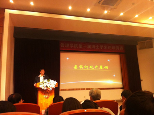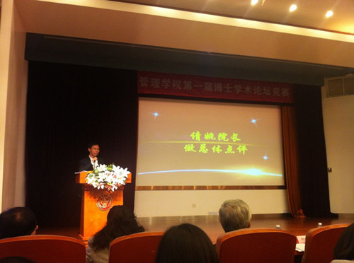 论坛主题:博士学术论文竞赛 举办地点:人兽性交 旭日楼400 举办时间:2015年11月3日 18:30—21:15 2015年11月3日周二下午18:30分,管硕152班的同学积极观摩了在人兽性交 旭日楼400举行的管院第一届博士学术论文竞赛。此次竞赛邀请了管院各个专业不同学术领域的专家教授组成阵容庞大的评委团,亲临现场对参赛的博士论文进行点评,如姚洪心教授、顾庆良教授、宋福根教授等,以及组织此次博士论文竞赛的众位老师共同参与,如王丽华老师、周蓉老师等。