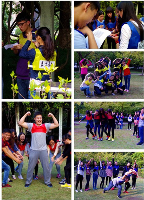 2015年11月5日下午3点40分,管理154硕班在旭日楼门前的草坪上开展了主题班级团建活动,此次活动的开展旨在让同学们能够在游戏中缓和初入研究生阶段的学习压力,加深同学们之间的情感联系;并且从中学习如何与别人合作,体验到团队合作的重要性,共同解决问题,加深集体认同,增加班级凝聚力。 活动的开头由154班的党支部书记程帅、副书记李爽以及班长光善军、副班长胡梅担任主持人,简单介绍了游戏规则并分发名牌,在游戏正式开始之前将班上同学分成三组,每组组员身穿“红、黄、蓝”三种不同颜色的“战衣”,并组织大家进行小组风采展示。