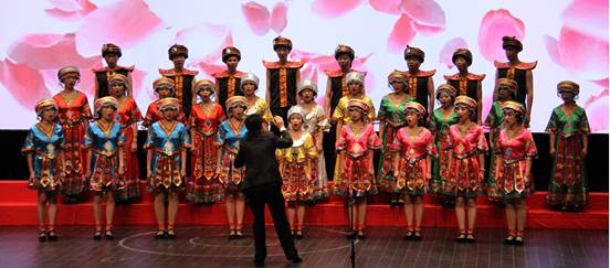 在演出现场,合唱团全体团员穿着美丽的阿美族服饰,伴随着悠扬的钢琴声,动人的音符与美妙的歌声交织在一起,花瓣飘飘,丰收在即。姑娘小伙们动情歌唱,为了心中的梦想、信念和荣光,给台下观众带来了完美的视觉和听觉体验,展现了东华MBA的风采。