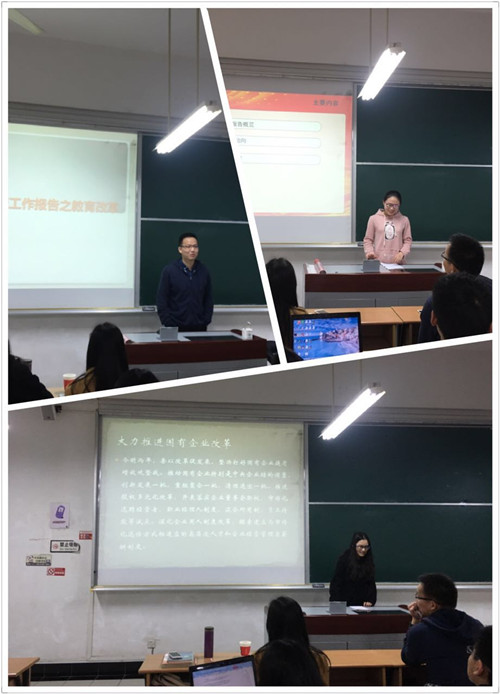 2016年3月18日18:30,管理154硕党支部在四教204举行了“两会”专题组织生活会,党员和入党积极分子围绕今年两会的热点展开了学习和讨论。会上支部的所有党员、和积极分子重温了两会的重要议题以及关系到百姓民生的提案、议案,解读了政府工作报告和五大发展理念,使每位同学对两会都有了更为深入的认识,进一步学习了两会精神。本次学习组织生活会以小组主题演讲的方式呈现,所有党员和积极分子分为五组,就两会的不同视角进行解读和阐述,并同其他同学进行互动交流。 一、政府工作报告解读 第一组同学的演讲围绕政府工作报告展开,分别阐述了政府工作报告的主要内容以及热点问题。江曼从以下从三个角度:回顾2015、部署2016、展望“十三五”规划,为大家解读了1.9万字的政府工作报告。她从新闻报道中提炼出十个关键词:经济增长预期6.5%-7%、供给侧结构性改革、新经济、扶贫攻坚、政府自身建设、反腐倡廉、重拳治污、新型城镇化、民生改善、对外开放,其后以数据和图表的生动讲解,描绘了“十三五”规划的小康目标和民生福祉。随后光善军解读了报告当中的教育改革,他列举出李克强总理发放的十个“红包”:农村孩子圆梦大学、创业带动就业、扩大高校和科研院所自主权、提高乡村教师待遇、教育公平、免除学杂费、普通本科高校向应用型转变、缓解“入园难”、关爱残障儿童、推进远程教育。最后袁方敏简单阐述了国有企业的深化改革,国有企业对供给侧改革的结构调整起着至关重要的作用,推动国企改革和供给侧改革是相辅相成、相互促进的。国企改革要为供给侧改革和整个十三五规划提供动力,国企改革是以产权为主要内容的体制改革,国企供给侧改革是以产业结构为主要内容的改革,国企改革由单纯的体制改革向产权体制与产业结构二重奏改革转变。