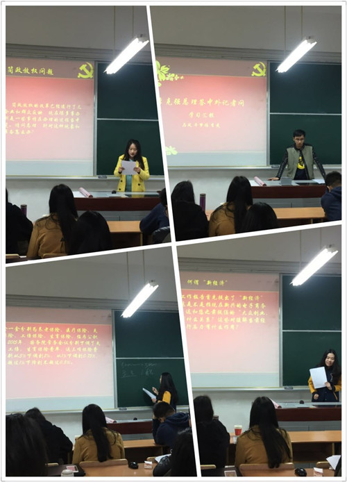 二、两会热议议案解读 第二组肖杰杰为代表,对与民生问题紧密联系的环境问题、高校学生就业问题、外出人口问题和社会保障问题这四大热点进行了详尽的介绍。当肖杰杰提到高校学生近些年来积极主动地进行创业来带动就业的现象时,在座的所有同学都感同身受,讲述自己身边发生的一些创新创业现象,以及创业所需要的坚毅品格。同时,大家也认为创业并不一定适合所有同学,但创新创业能够为社会注入新鲜的血液,将产业联合,提供更多的人才需求岗位。 三、五大发展理念解读 第三组从源头上为大家普及在2015年十三届五中全会结束后《中共中央关于制定国民经济和社会发展第十三个五年规划的建议》中的五大发展的理念,分别是:坚持创新发展、协调发展、绿色发展、开放发展、共享发展。创新、协调、绿色、开放、共享五大发展理念为“十三五”谋篇布局,在今年两会中,习近平总书记也围绕着这五大发展理念,将其具体内涵阐述给人大代表团。同时李克强总理在政府工作报告中也把这五大发展理念贯穿始终。第三小组党员薛靖驰分别对五大发展理念进行了解读,尤其是对处于核心地位的“创新”发展进行了全方位的解释:创新是一种思维模式,曾经在依靠出口、投资两大需求拉动经济增长成效渐减的情况下,中央政府根据经济新常态的现实情况,就创造性地提出了减少无效和低端供给,增加有效供给,使供给和需求协同促进经济发展,提高全要素生产率不断解放和发展社会生产力。他提到结合党员们所学习的专业也都是和经济学相关的,对这样的创新型改革措施更是应该从供求关系的本质去深入理解。 四、李克强总理答记者问 第四组的李爽从总理对中国经济发展问题的回答中,提到中国经济现在面临的是市场不稳定问题,而有关方面采取综合性稳定市场的举措,实际上是要防范发生系统性的金融风险,不论是股市、债市、汇市这些金融市场,本质上是市场,还是要推进市场化、法治化的改革。马凤针对记者提问总理关于简政放权下一步会如何进行的问题,给大家做了解释,李克强总理认为简政放权是政府职能转变的关键,在过去的三年中政府确实已经了减少了很多的审批事项,接下来要做的就是能公开的应该全部公开,能上网的尽可能上网,及时回应社会关切。然后,牛梦雅对很多党员同志以及积极分子都不太清晰的“五险一金”的具体内容进行了细致地知识普及,并同正身处研一的同学们讨论了今后养老金的缴纳和发放问题,现场互动热烈。 五、两会常识 第五小组着重讲了与两会有关的常识。从两会的历史、发展到两会的意义、职能,明确了中华人民共和国全国人民代表大会和中国人民政治协商会议的区别,辨明了人大代表与政协委员权利和义务的不同,另外,就“全国两会为什么都在三月开”、“政协怎么总是比人大提前两天开”等问题也进行了说明。两会制定修改国家法律、选举国家领导人,涉及社会发展各个层面的议题,两会期间,政府都会回顾一年来的工作,再报告下一年的重点政策,这些政策对国家发展和百姓民生将产生重大影响。党员谈两会、议两会,常识是基础,只有对两会的基础知识有正确的了解,才能正确看待两会的作用,才能正确定位两会的视角,才能正确理解两会的议题,才能正确明晰国家的发展方向和道路。