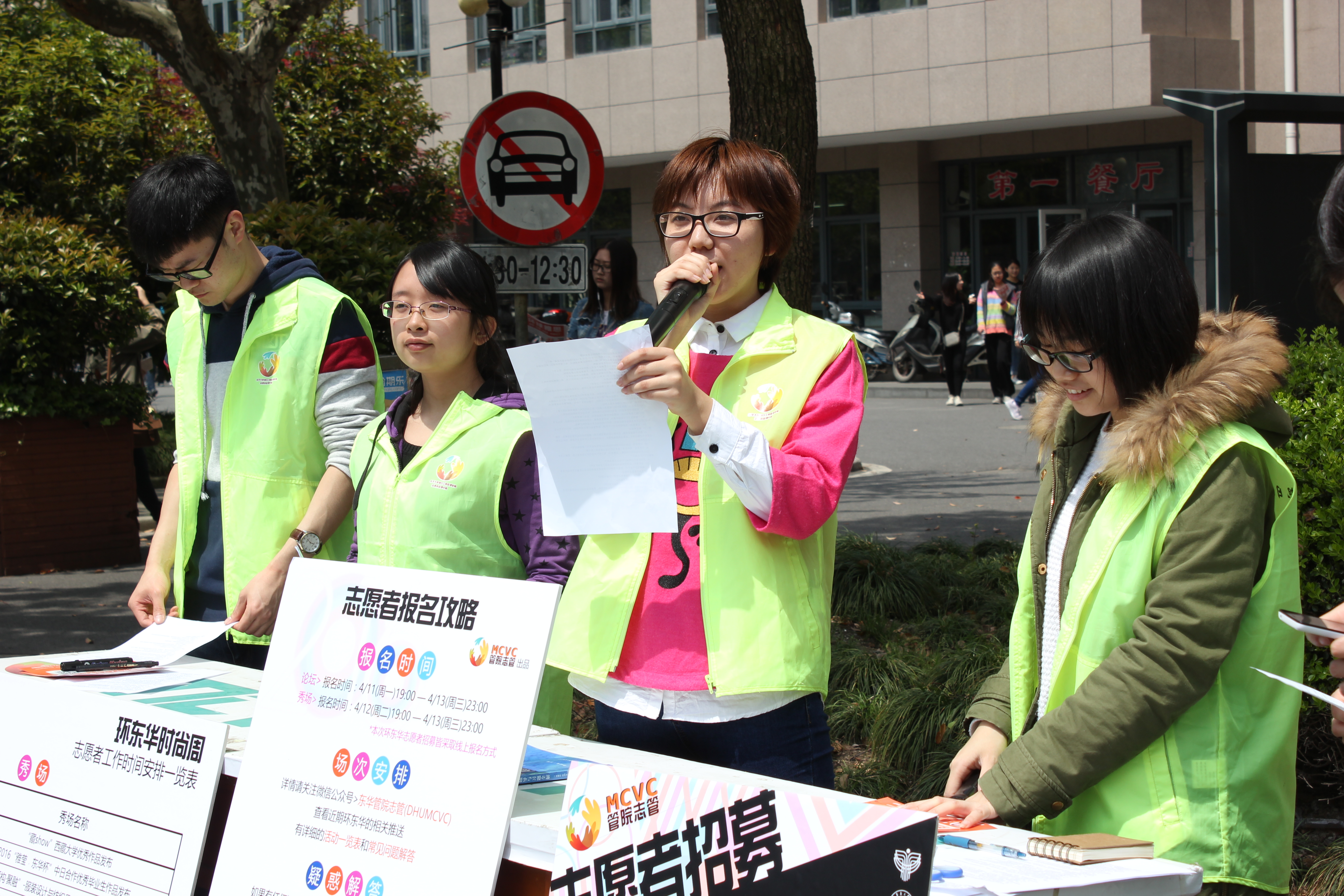 伴随着一年一度的盛事——“环东华时尚周”的临近,时尚周志愿者的招募活动也如火如荼地进行着。本周(4月11-15日)每天中午,人兽性交 志愿者管理中心(含管院阳光服务队)都在二食堂门口摆摊,面向整个校区进行志愿者招募。