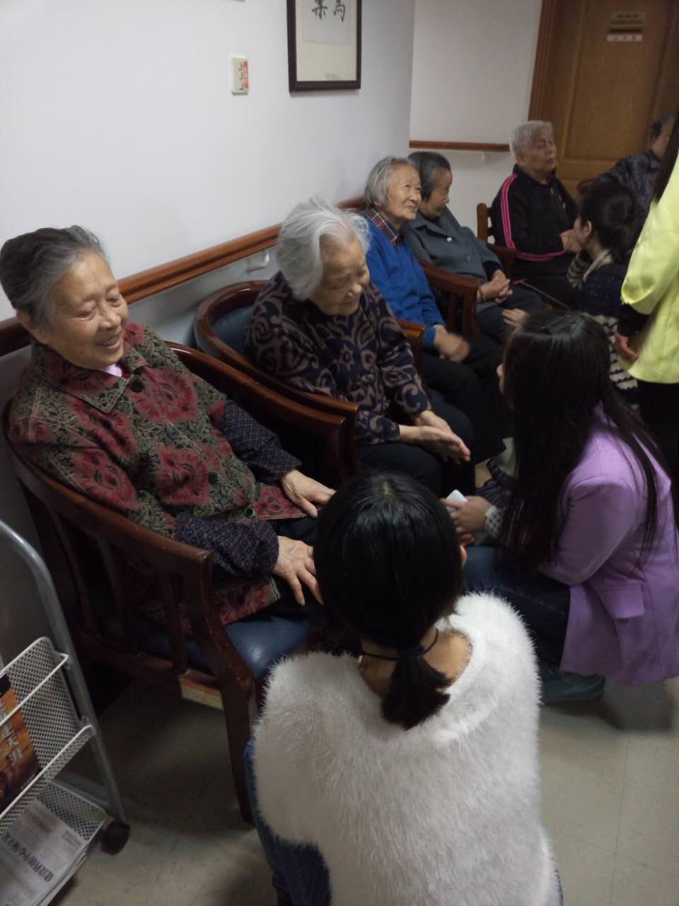 当来到老人们居住处时,已经有些许午睡之后的老人聚在一起聊天、看报、写书法。在看到志愿者们到来后,老人们在朱奶奶的安排下齐齐围坐着,观看志愿者们表演节目。虽然爷爷奶奶们爱听的老歌同学们大都不会唱,但是大家也竭尽所能演唱他们那个年代爱听的歌曲。刚开场,程帅、牛梦雅带来了动听的歌曲:《草原上升起不落的太阳》、《康定情歌》、和《我的祖国》等,嘹亮的歌声使老人们听得都乐开了怀,双手为他们点上大大的赞。表演节目的过程中,爷爷奶奶们也都情不自禁地哼着调儿,拍着手,加入了大家的演唱中。其中三位老人也热爱音乐,还组成了一个小合唱队,当爷爷奶奶们慷慨激昂地唱着《共筑中国梦》和《驼铃》时,她们仿佛又回到了保家卫国的时候,热血沸腾,飒飒英姿依然不减当年。