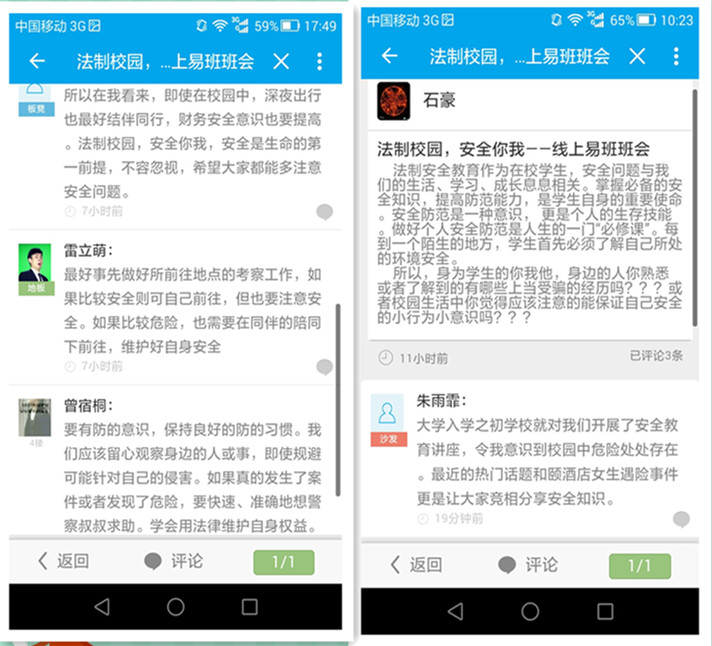 线下主题班会后,以寝室为单位进行小组会。同时,在易班班级群内发布了“法制校园,安全你我”的主题帖。各寝室在学习之后采用了知识小竞赛的方式,进一步调动了同学们学法知法的积极性。每位同学都在主题帖下畅所欲言,抒发自己的感想,提出自己的建议。其中不乏言论精彩、逻辑清晰的发言,或感人肺腑,或发人深省,使线上易班班会取得了良好的成效。