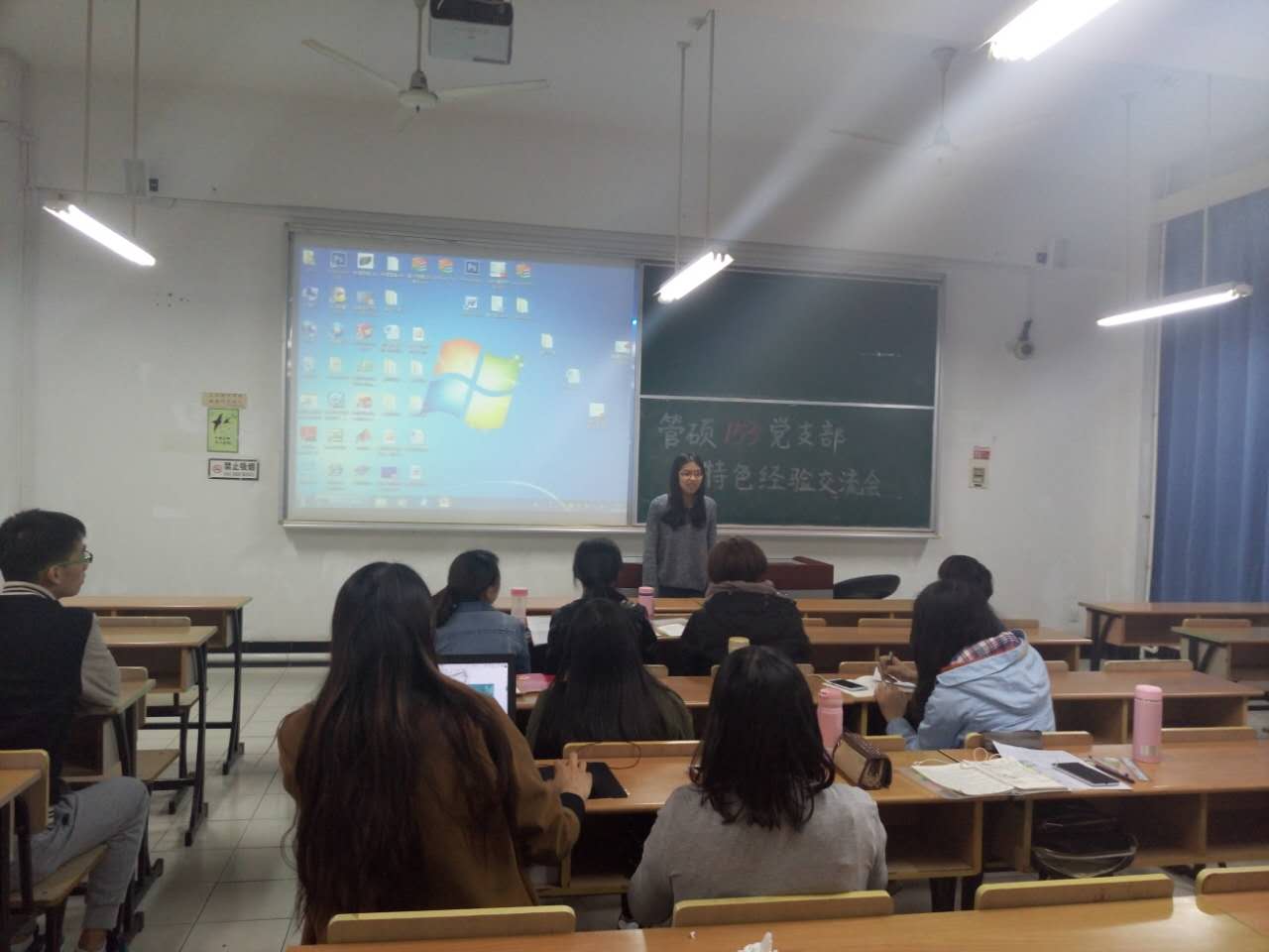2016年4月27日晚上6点30分,管硕153党支部于四教104进行了4月份组织生活会。本次组织生活会采用了很特别的方式,以“分享经验,携手成长”为主题,部分优秀的党员进行了经验分享。这次组织生活会突出了我支部的特色,进行了创新,大大不同于以往的形式。 1、“两学一做”活动宣传 党支部书记张怡同志,向支部党员宣讲文件精神,讲述了接下来党员需要参与的一系列活动。包括学习党章、自律准则、纪律处分条例,同时在接下来,要在支部内兴起一种优良作风,在同学们之间传播。