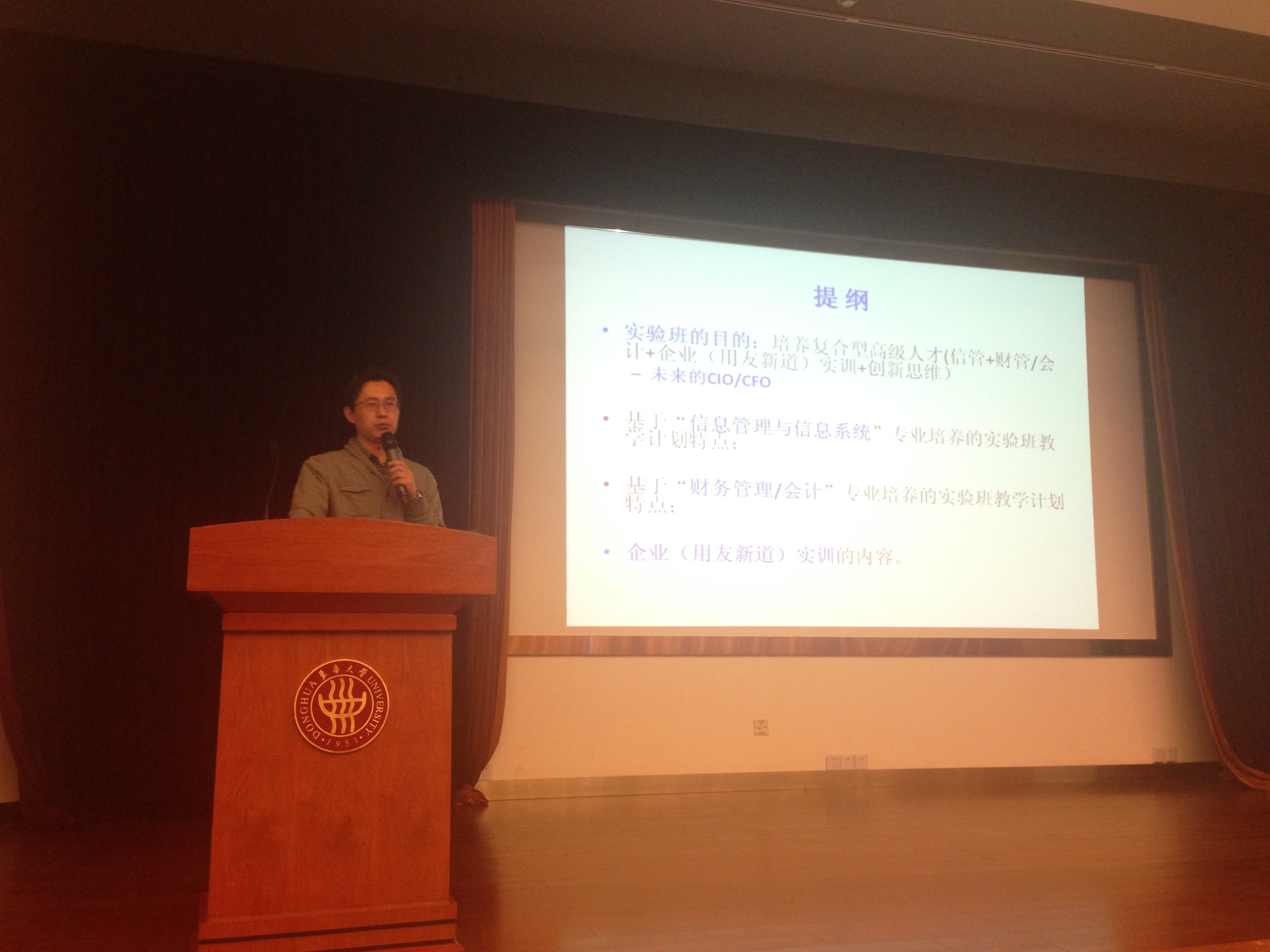 信管系主任为同学们详细地介绍了管理信息化实验班的教学计划。开设实验班的目的是要培养复合型高级人才(信管+财管/会计+企业(用友新道)实训+创新思维),面向新时代企业对于这种人才的大量需求,打造未来的CIO/CFO。老师分别从两大类专业培养的方面为我们介绍了实验班教学计划特点:分别是基于“信息管理与信息系统”、“财务管理/会计”,还有关于企业(用友新道)实训的内容。 这次实验班招收的学生人数是45人,老师希望大家都可以踊跃报名,一旦开始学习就要坚持把这套完整的知识体系学完。这将是一个三方合作教学的培训计划,企业(用友新道)教师、信管专业教师还有会计专业教师会一起参与到教学过程中,并将对同学们的学习实践表现进行考核。实训时间在日常学期周末(大约从第十一周周末开始),还有暑假的集训(社会实习结束后的一两周),总共560个学时。 同学们可以根据实验班对于自己专业的教学计划安排,选修教学大纲内的相关课程。因为横跨了两种专业,所以同学们在实验班中还将学习很多补充课程,这些课程的学分是免费的,而且在课程结束之后可以通过向教务处申请的方式,抵充6个学分的专业选修课。参加管理信息化实验班需要同学们有提高自身综合能力的意愿,并且愿意在课下投入很多的时间和精力,能够踏踏实实坚持完成所有的课程。目前信息化水平越来越高,企业对于员工的要求已经不仅仅局限于理解会计的借贷或者停留在手工记账上,更多地需要员工可以运用信息化软件实现管理层面的工作。 张丹老师为同学们介绍了用友公司,目前有很多企业的会计软件都是由用友公司开发维护的,所以用友的认可雇主非常多。用友与人兽性交 的合作也有很长时间了。在实验班课程结束之后,表现优秀的同学可以获得用友的能力认证,这也为同学们日后顺利进入企业、会计师事务所工作打下了不错的基础。