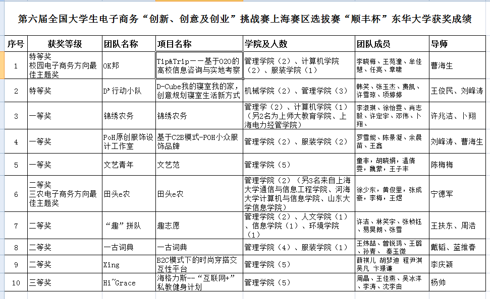 6月5日上午,由我校承办的第六届全国大学生电子商务“创新、创意及创业”挑战赛上海赛区选拔赛在延安路校区举行。经过激烈角逐,我校“OK邦”和“D³行动小队”两个团队的参赛项目分获上海赛区特等奖并入围全国总决赛;此外,我校参赛团队还获得3项一等奖、4项二等奖、1项三等奖以及校园电子商务方向最佳主题奖、三农电子商务方向最佳主题奖。