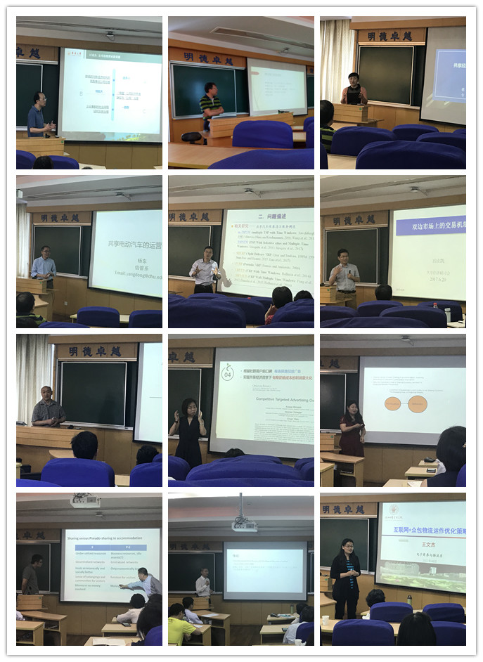 的教师将各自的研究课题归纳成8个模块,分别是“共享租赁决策管理”、“共享经济建设服务”、“共享经济发展演化”、“共享价值计量模型”、“共享模式企业变革”、“共享经济运营决策”、“共享物流运作优化”和“共享活动客户分析”。各个领域的专业教师从不同角度共同探讨经济学领域的同一主题,展示汇报了各自相关研究成果的同时,台上台下互动交流,相互启发探讨,思想火花碰撞,讲座气氛十分热烈。