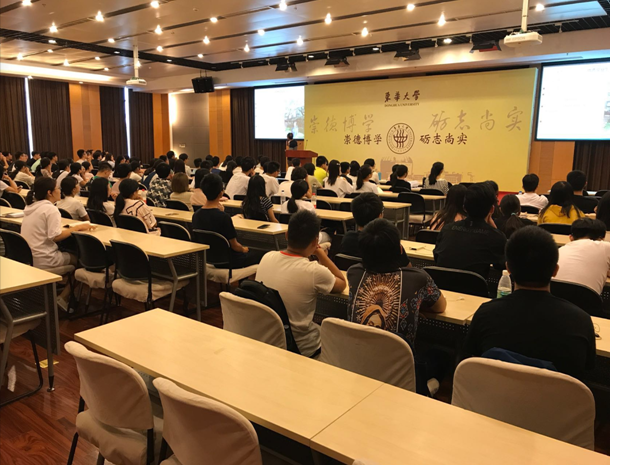 紧接着,吴晓隽老师向新生娓娓道来,希望大家“看清自己,积累自己,让自己不断进步,不留遗憾”。吴老师在介绍专业时,打破了大多数同学对该系有限的发展方向的看法,并表示会展经济及旅游管理专业实际上具备广阔的前景。对于培养人才,“宽基础,重实践”是该系的关键词。吴老师通过多个优秀学生的例子告诉大家该系多年与美国迪士尼合作的项目等为同学们提供了很好的实践机会,也向社会输送了大量高水平的旅馆管理人才。最后,吴老师“希望各位同学能独立思考,找准定位,勇往直前,领略属于自己的风采”。