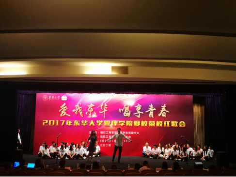 紧随其后上场的管科1704团支部也用歌声唱出了他们自己的心声,带来了东华校歌和自选歌曲《没有什么不同》,我们在人生的道路上难免会遇到挫折,或许会羡慕于别人的,失望于自己的路,但其实只要足够努力,我们和大神们也没有什么不同。谨以此歌献给对前路迷茫的人们。接着,管科1703团支部演唱的是东华校歌和《最美的太阳》。 接下来上场的是充满诗意的经济1704团支部,除了演唱东华校歌,他们还选择了《倔强》做自选歌曲,唱出他们的爱校情怀。选择东华,选择远方”我便只顾风雨兼程,青春倔强,坚持理想,纵然疯狂,依然以刚克刚。爱我东华,砺志尚实,青春张扬,铸就新的辉煌。随后上场的经管1705团支部充满青春活力,为大家带来了东华校歌和一首轻快的《青春修炼手册》。九月的风轻轻吹过,携着树叶的清香,也带来了你我十八岁青春的芬芳,天南海北的学子,齐聚东方明珠,华东魔都,相遇在人兽性交 ,共同演绎他们四年的青春岁月。” 上半场的压轴节目是由经济1703团支部带来的东华校歌和《红旗飘飘》。红旗飘飘,飘扬着我们的梦想和未来,让经济1703班的红旗飘飘唱出对祖国最真挚的祝福同学们虽然没有华丽的辞藻,却用真诚的声音唱出了他们对祖国、对学校的热爱。上半场在同学们振奋人心的歌声中结束了,短暂的中场休息之后,下半场的活动同样高潮迭起。