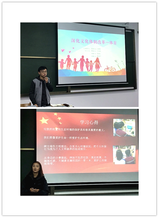 分享会正式开始之前,支部书记魏冰老师从三件事的分享引发同学们的思考,让同学们从身边事深刻领中国特色社会主义制度的最大优势是中国共产党的领导。同时,魏冰老师还就活动意义进行了深入阐述。最后,魏老师对学习之后如何来践行十九大精神提出了要求。并提出了“把讲政治、谈实证形成一种时尚”。营销1501范同学还原十九大报告中所提及的文体事业改革的具体措施、取得成果及深远意义。他从东华校庆66周年和东华足球60周年出发,全面展示了对发展体育事业,养成健康生活习惯的深入思考。足球1601的同学学习了生态文明体制改革中的史上最严生态环境保护制度,运用两组图片鲜明而强烈地对比了恶劣环境的人心向背和绿水青山就是金山银山的最好例证。多位积极分子表示,在制度建设美丽中国的同时,‘保护环境,人人有责’,这最质朴的倡议表达了大家最内心的期盼。此外,积极分子们对科技、经济、外交领域兴趣也很浓厚:惊艳世界的中国高铁,以及天宫、蛟龙、大飞机等重大科技成果相继问世,城乡居民收入增速超过经济增速、扩大就业、精准脱贫等一系列经济民生成果,无一不紧扣人民日益增长的美好生活需要的核心目标。宋同学重点解析了报告中对营造清朗网络空间的论述,强调中国7.5亿网民(2017年6月行业报告数据)的巨大规模,企业需在互联网+实体经济领域深耕并坚持创新。十八大以来,以习总书记为首的主动外交策略更为中国赢得世界好评,世界发展已无法忽视中国,民族自信心和自豪感大大增强。