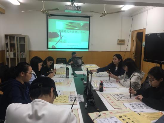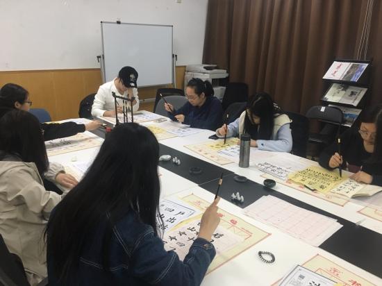 徐老师为大家准备了专业书法用具和临摹字帖,为同学们研习书法创造了良好的条件。在春江花月夜的音乐背景下,徐老师为大家介绍了汉字和书法的起源和发展,讲述了如何执笔、临摹字帖的注意事项以及中国历史上书法大家的优秀书法作品,感受书法特有的艺术魅力。