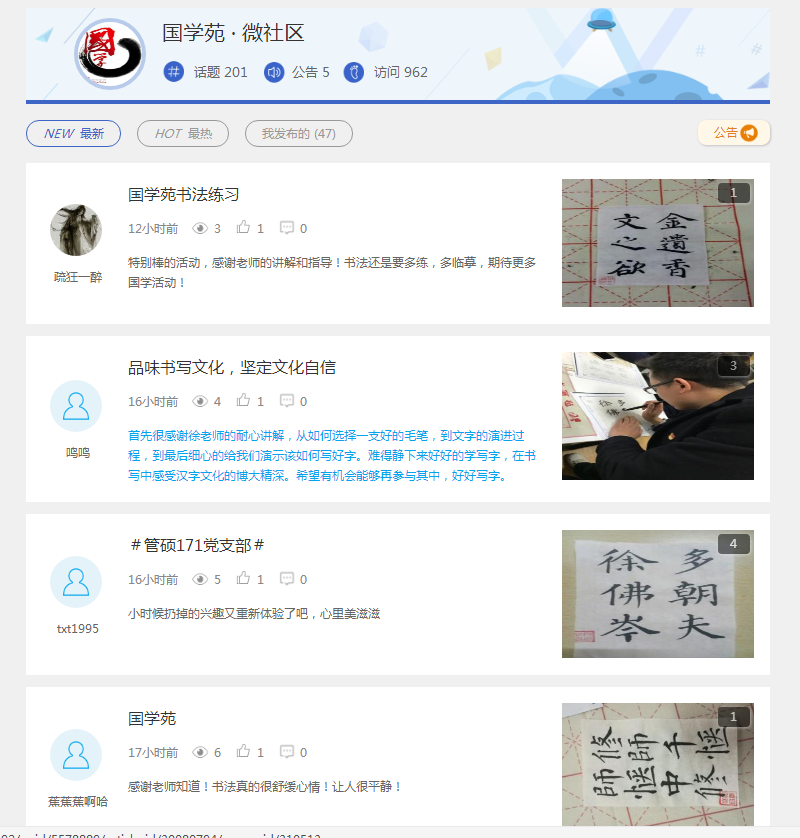 据悉国学苑是学院申请的校级易班特色项目,旨在:一、开辟院级传播中华优秀传统文化的在线平台,让更多的管院学子了解国学、学习国学,继承和发扬国学;二、提高学生的人文素养和精神情操,培养“通古博今、经天纬地”的经管精英。项目开办至今,发布话题帖201个,上传国学资料200多份,累计访问量962人次,线下活动举办十几场,累计接待学生研习活动近400人次(含本科生、研究生)。今后国学苑将购置更多学习书法技艺的书籍,以供同学们共同交流学习,同时开办了国画研习活动,不断丰富国学苑的线下活动,使更多的热爱中华优秀传统文化的学生参与进来,共同弘扬中华优秀传统文化。 撰稿人:徐志德 |