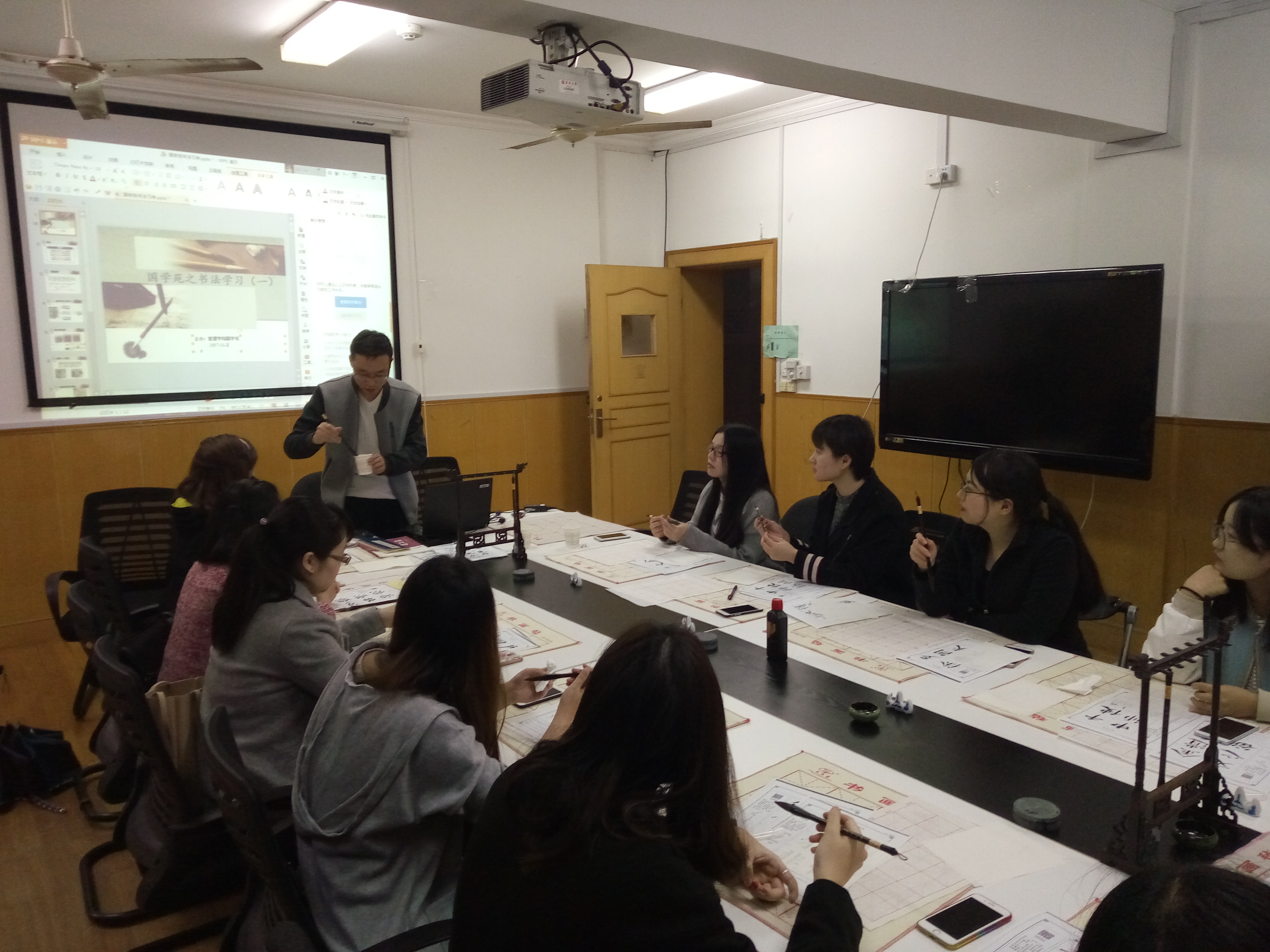 学生办公室会议室5118都会迎来一批特殊的“学生”:他们利用课余时间,参与国学苑书法研习活动。在优美的中华古典音乐声中,项目主持人徐志德都会先从国学苑创办的缘起开始讲起,接着讲解书法艺术的历史演变、中国汉字的演变历史、毛笔用笔基本规范等。随后学员们在徐老师的指导下,使用准备好的“文房四宝”,开始一笔一划的临摹书法字帖,在书写中体验书法艺术的精妙。学生通过书法研习,不仅增强了文化自信,也陶冶了情操,提高的审美水平。