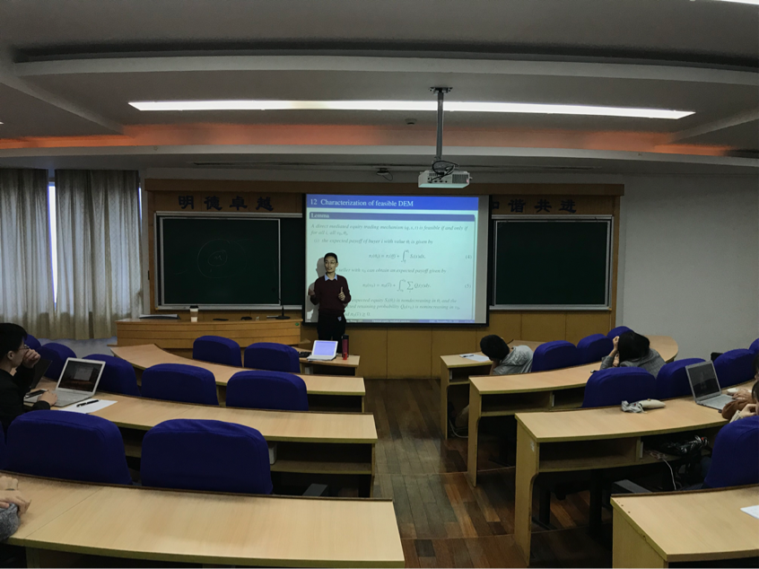 师生主讲了一场以“Optimal mediated equity auction”为主题的学术报告会。报告会由宫汝凯副教授主持。