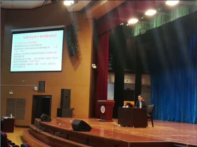 此次党课主要分为三个部分,分别为“改革开放四十年历程与启示”、“当前几个形势热点问题分析”以及“增强新时代的责任感和使命感”。在第一部分,陈教授先是指出2018年的重要历史时间节点地位,这是贯彻落实党的十九大的开局之年,是改革开放40周年和全面深化改革关键之年,是全面从严治党向纵深发展和党的建设向质量强党转型的关键阶段,是马克思诞辰200周年,更是决胜全面建成小康社会,实施“十三五”规划承上启下的关键一年。改革的任务任重道远,我国面对的形势也是挑战与机遇并存,正值一带一路五周年,中国在国际舞台上的话语权越来越大,但是霸权主义时刻都在蠢蠢欲动,激战正酣的中美贸易战无疑带来了我国经济的短期阵痛;为了完成全面建成小康社会的目标,需解决祖国统一问题,精准扶贫,协调区域共同发展,提升人民的幸福指数。