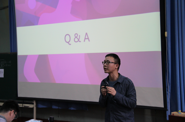 (丁伟老师发表讲话) 随后,管院志管主任——田明天同学向志愿者们简单介绍志愿服务地点、优秀志愿者评比制度、志愿服务注意事项与安全问题,其中着重强调本次时装周的证件使用说明。