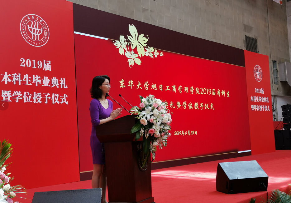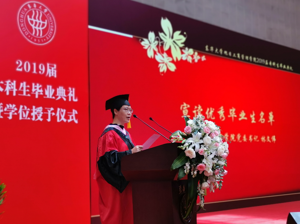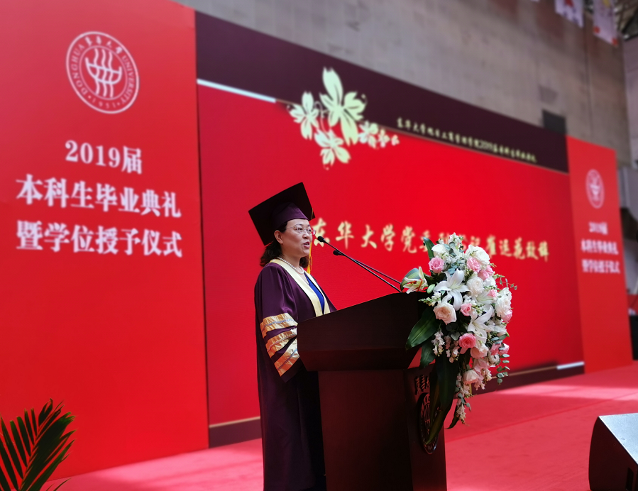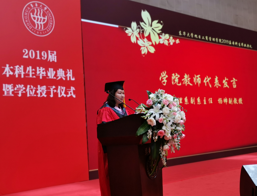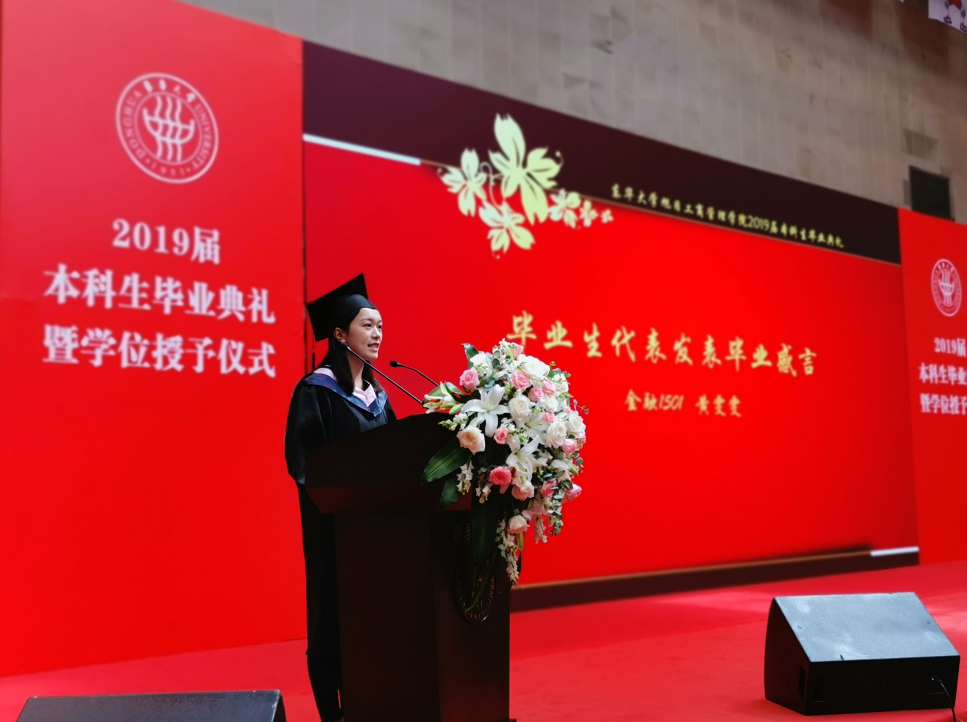 在毕业生代表发言环节,2019届毕业生代表黄雯雯带领同学们一起回顾了大学四年的成长轨迹。黄雯雯同学深刻感受到,“崇德博学、砺志尚实”的校训时时刻刻鞭策着每一位东华学子爱校荣校、崇尚学术、追求卓越、敬业奉献。“严谨、勤奋、求实、创新”彰显着东华人的精神面貌。四年间,她收获了青春最美的回忆,收获了亲密无间的友谊,拥有了强烈的责任感,培养了勇敢追梦的自信,也学会了对生活充满感激。最后,她满含深情地感恩母校的悉心培育与老师们无微不至的呵护关怀,也祝愿所有毕业生们前程似锦,祝愿母校枝繁叶茂。发言结束后,毕业生代表徐智坤同学向学院赠送了礼物。