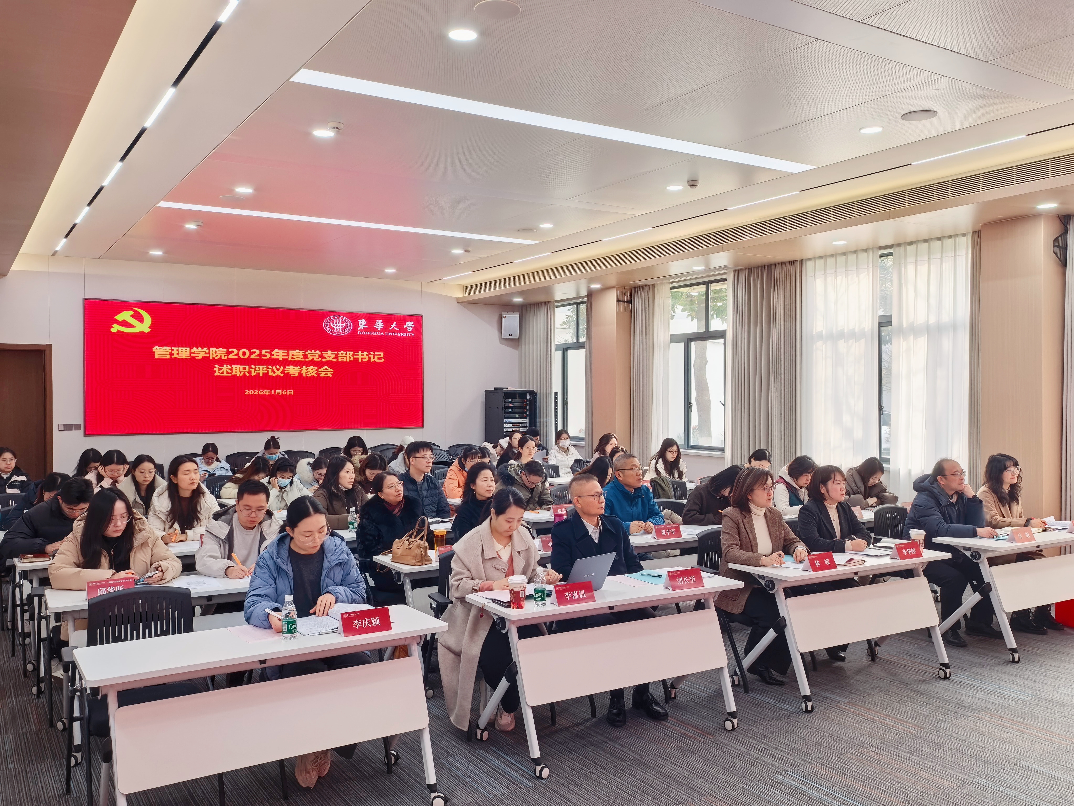 学院党委书记林嵘逐一点评并讲话,对过去一年各基层党支部认真履行主体责任,落实上级决策部署,不断提升工作质量作出的努力和取得的成效给予充分肯定,对存在的差距和问题提出工作要求,对2025年学院党委工作进行总结回顾,并对2026年工作提出希望。号召全体党支部坚定信心、勇担使命,以高质量党建引领推动学院高质量发展,为“奋进东华”高质量发展、教育强国建设凝心聚力,贡献力量。